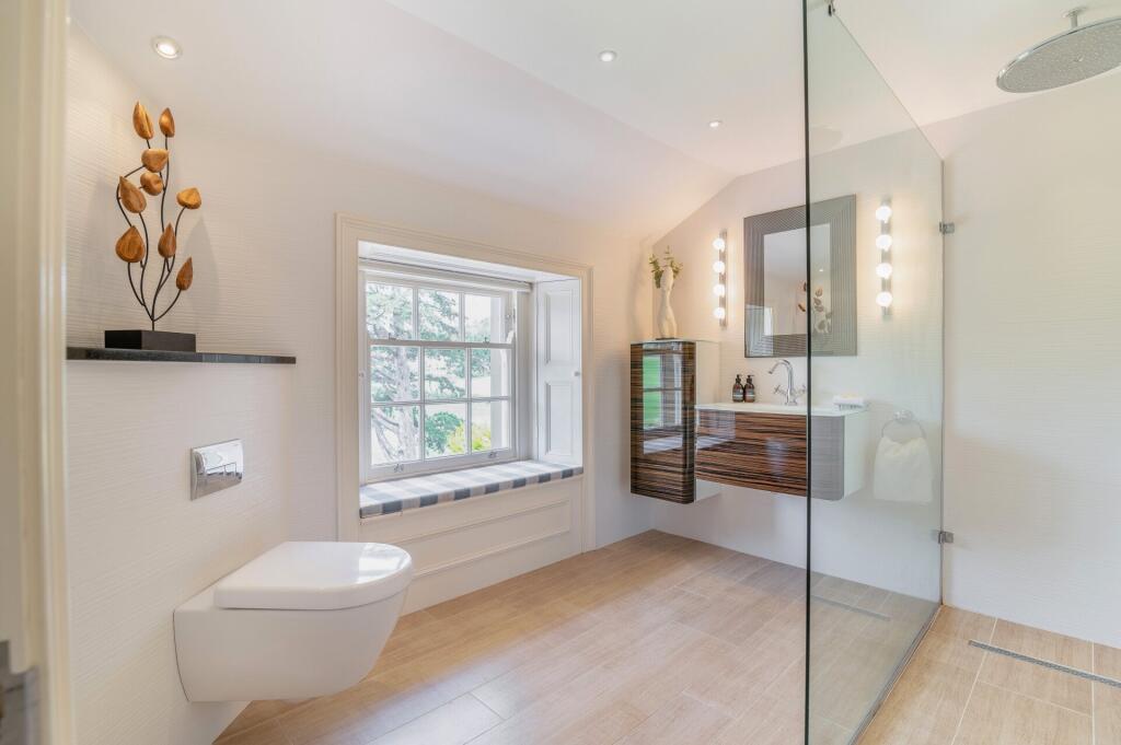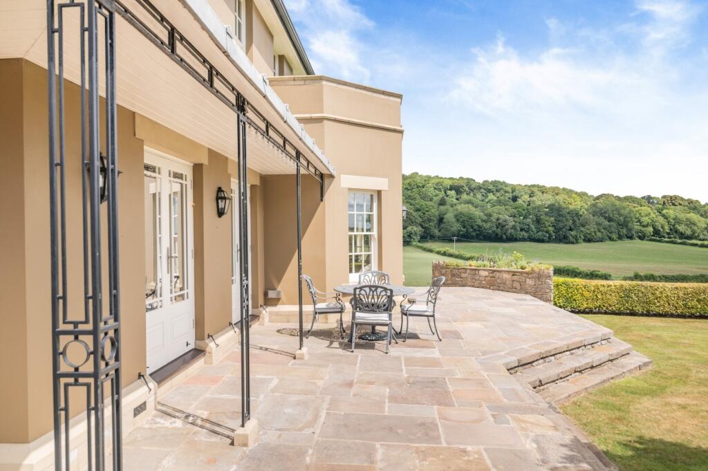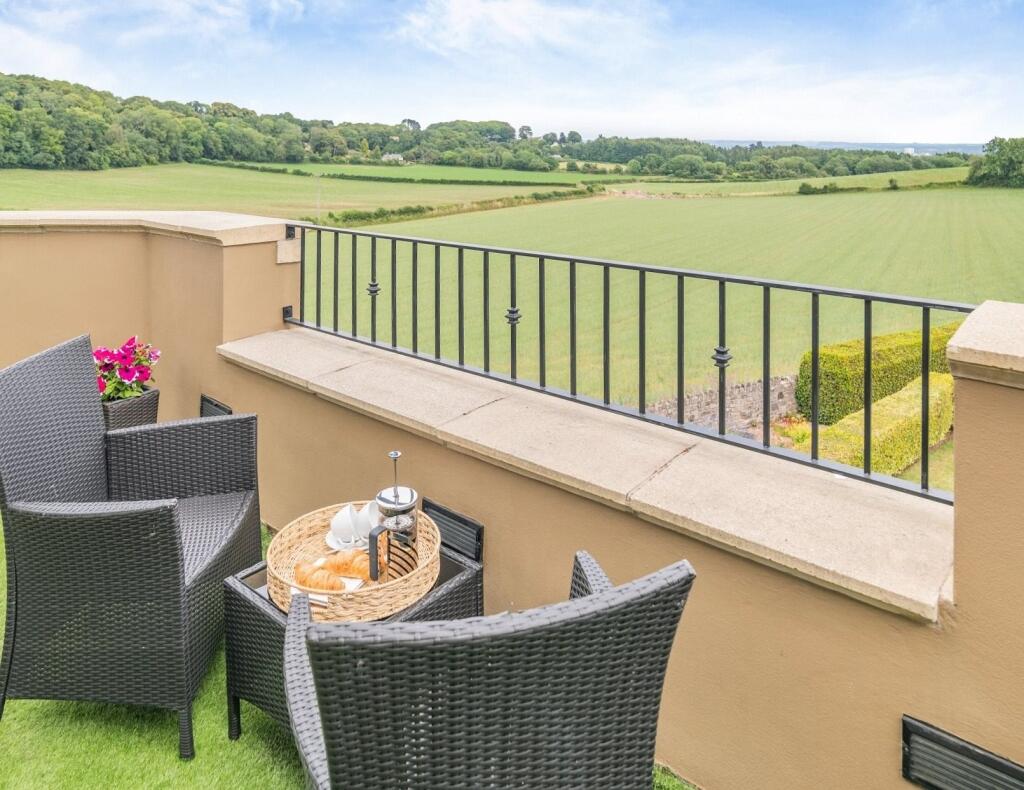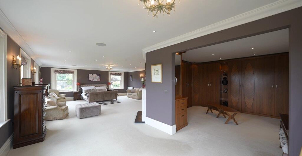 The principal bedroom suite is an exceptional private sanctuary, featuring a period Chesney fireplace, a Neville Johnson fitted dressing room, and a lavish en-suite with walk-in wet room nd freestanding claw-foot bath. A private balcony offers the perfect vantage point to take in the breathtaking rural views.