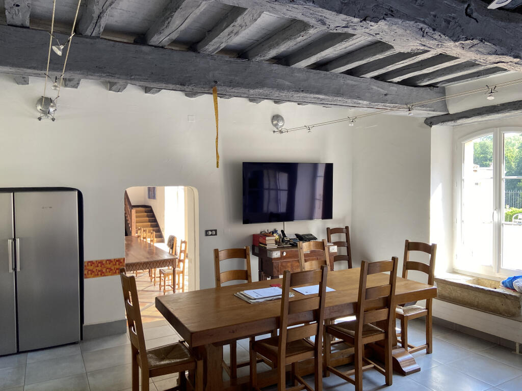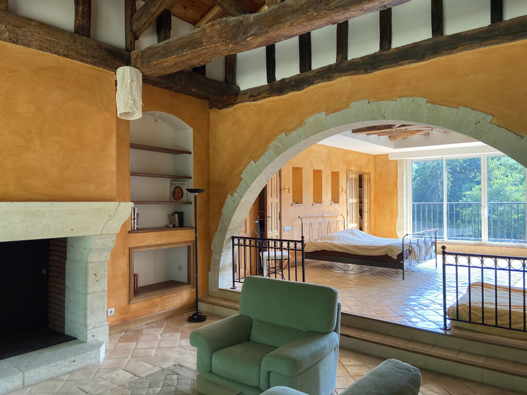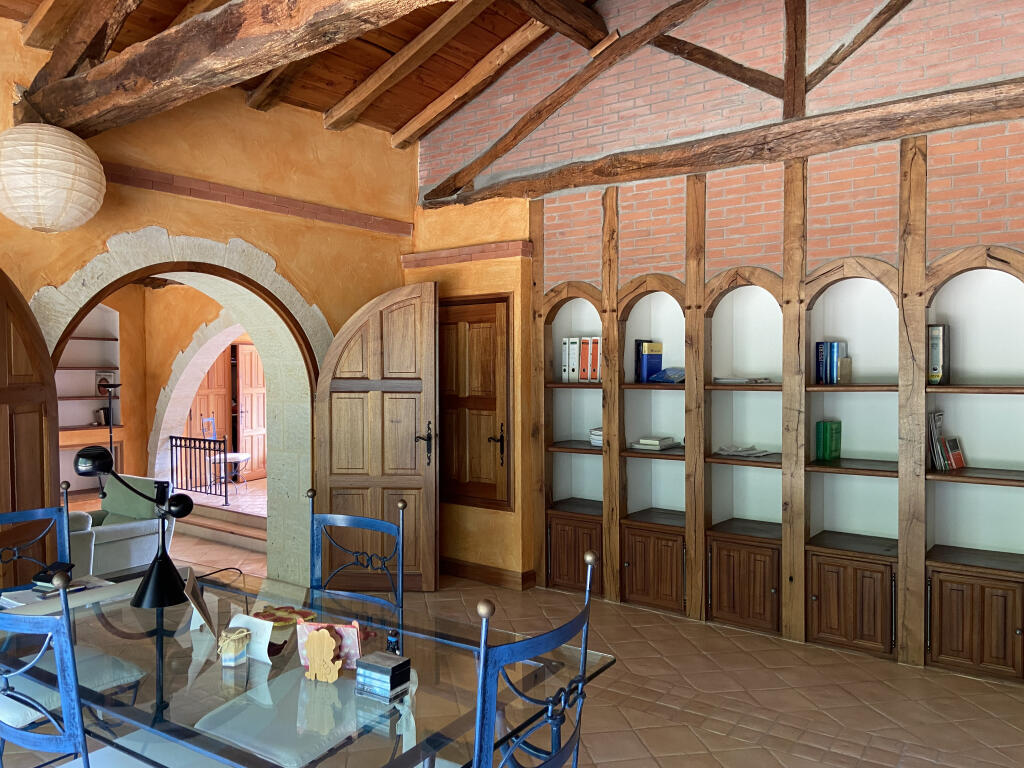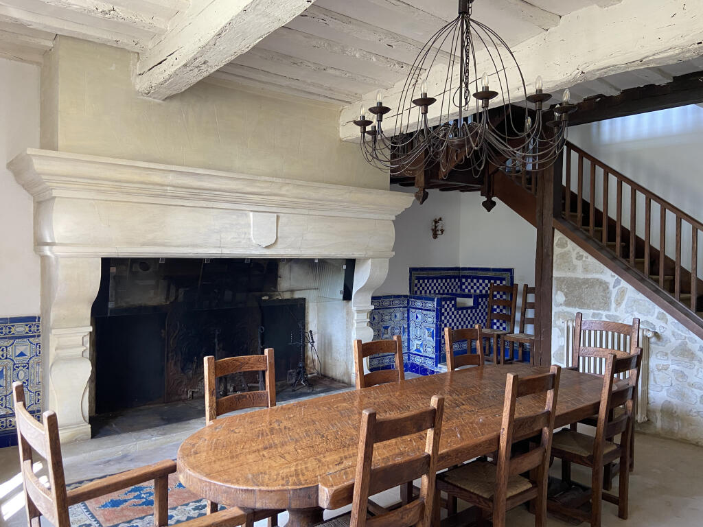 Terracotta floors, stone fireplaces, azulejos (Spanish-style tiles), oak beams, Haussmann-style double interior wooden doors, old press, stone sink, bookcase made of pegged oak wood, cob ceiling.