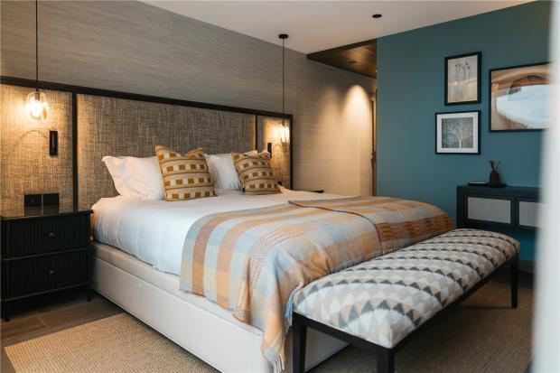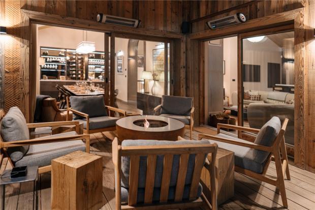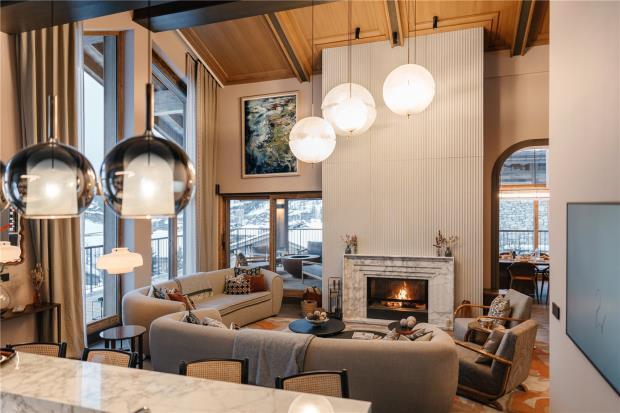 The top floor is dedicated to a striking double-height living space, centred around a wood-burning fireplace and bar, with expansive glazing, a professional kitchen and an intimate dining area. Large terraces frame panoramic views across the resort, particularly impressive after dark.