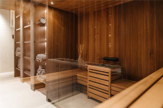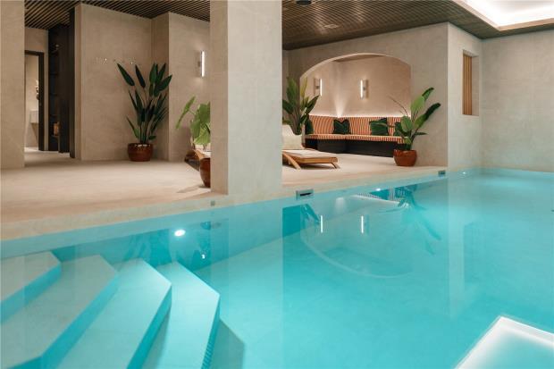A defining feature is the exceptional spa and leisure facilities, rarely found at this level even in Val d’Isère. Two lower floors are devoted to wellness and entertainment, including a large indoor swimming pool, sauna, steam room, jacuzzi and massage room, together with a cinema room with reclined seating and bar, and separate climate-controlled cave-a-vin.