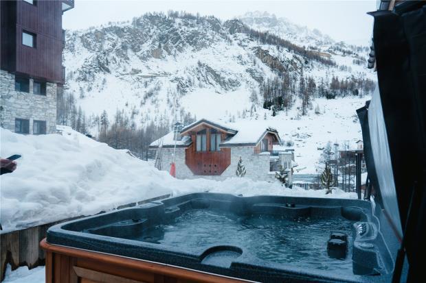 The property offers nine bedrooms, including two for staff, with principal guest accommodation arranged over two floors. Six en-suite double bedrooms open onto balconies with mountain views towards La Face De Bellevarde, two featuring private outdoor hot tubs overlooking the Santons piste.