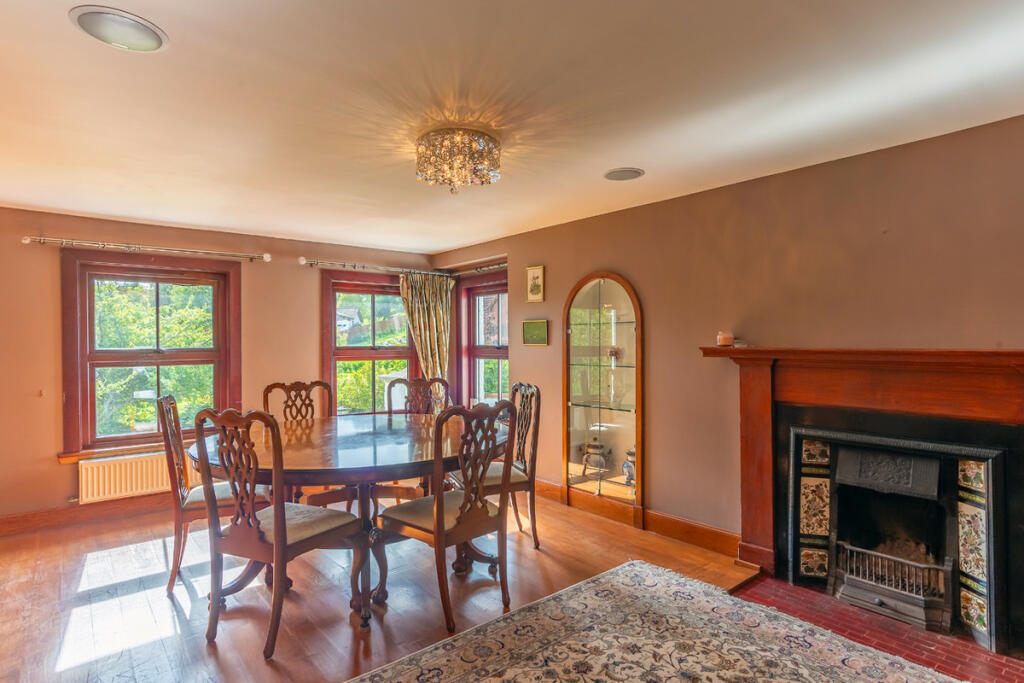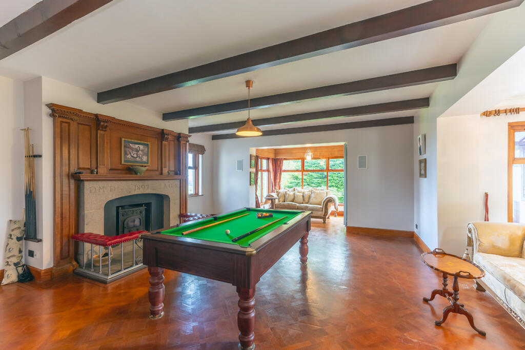 The main reception room of the house is the drawing room, featuring a stone fireplace from 1897 with a club fender, wooden overmantle, oak beams and parquet flooring. Two large window bays offer sumptuous views over the gardens, bringing light into this opulent and impressive space. One of the bays opens into a wooden conservatory through French doors.