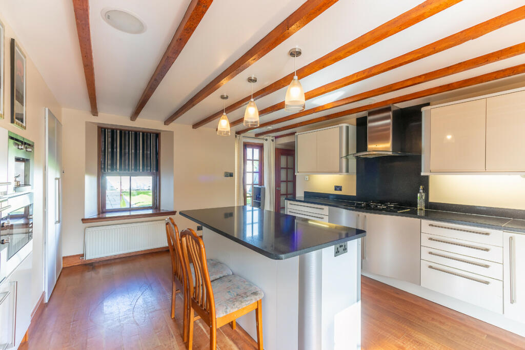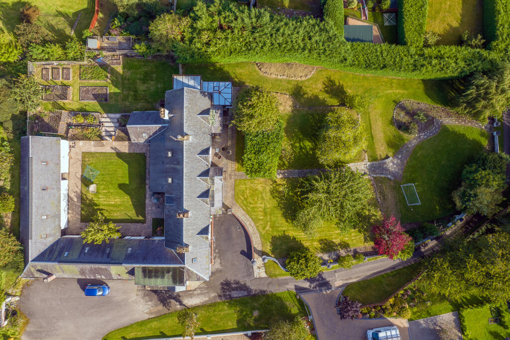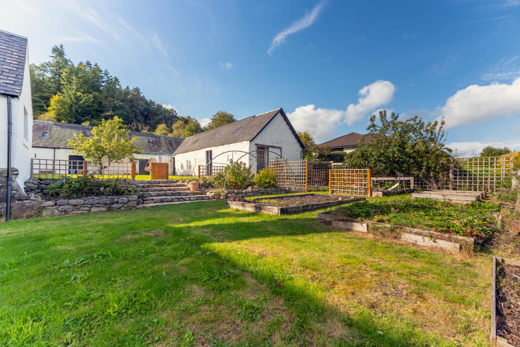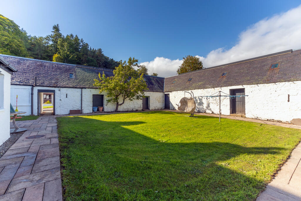 The gardens are a real haven, with lawns, mature trees, stone paving and walls, a kitchen garden and utility areas. An L-shaped steading offers considerable potential as guest accommodation or leisure space and has previously held permission for conversion into a swimming pool and gym.
