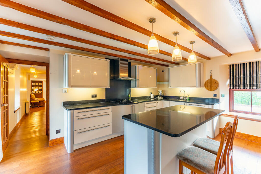 This fantastic kitchen is a contemporary delight with its state-of-the-art appliances, glossy white cabinetry and island, ceramic sink, and substantial marble worksurfaces. It contrasts fabulously with its traditional oak beams, wooden floor, and seat-height deep windows. The large gas hob and wide splash panel, stainless steel appliances, refrigerated drawers, and dedicated utility area away from the kitchen ensure the space is as practical as it is attractive.