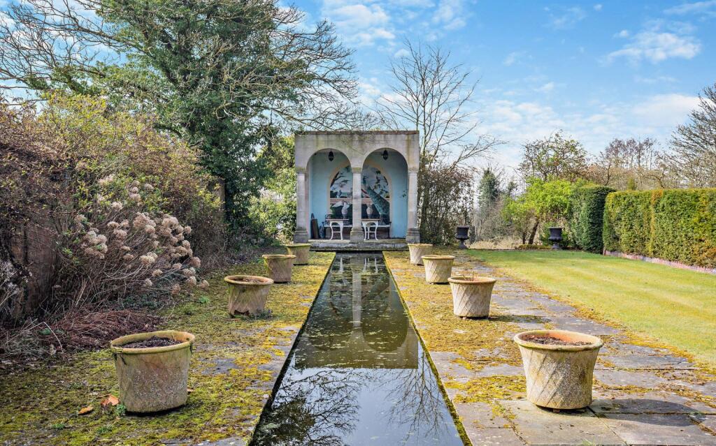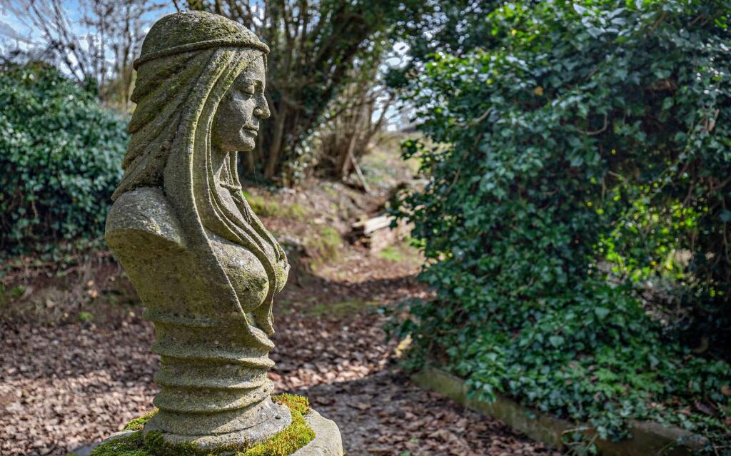 The coupler garden features an original sandstone wall, along with planted beds which leads into the cutting. Sandstone walls and cascades, offer a magical feeling as if you have stepped back in time and leads to the beautiful spring fed pool. The pool view area has a Matilda statue and David's folly. There is a wonderful woodland walk around the edge of the pool which leads to a summerhouse, made from brick and oak frame. This is a wonderful spot to watch wildlife or to relax whilst taking in your surroundings. The pool has a wooden bridge which leads you across into the orchard, beyond which is the arboretum planted with weeping willow, yellow leaf maple, Indian bean tree, cedar, tulip tree and has purple beech hedging on the boundary.
