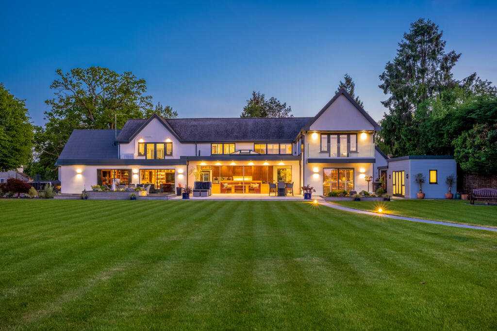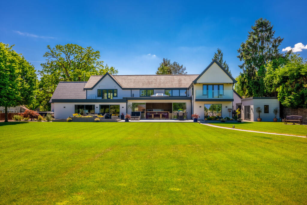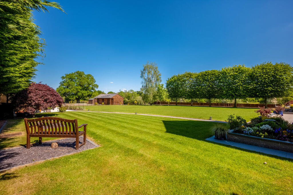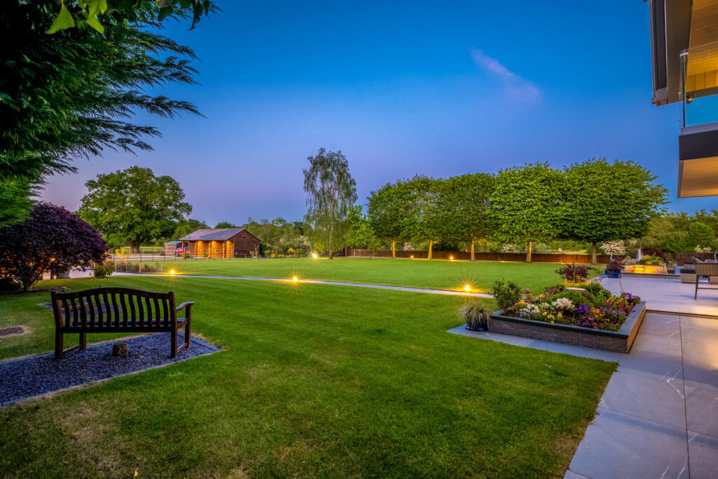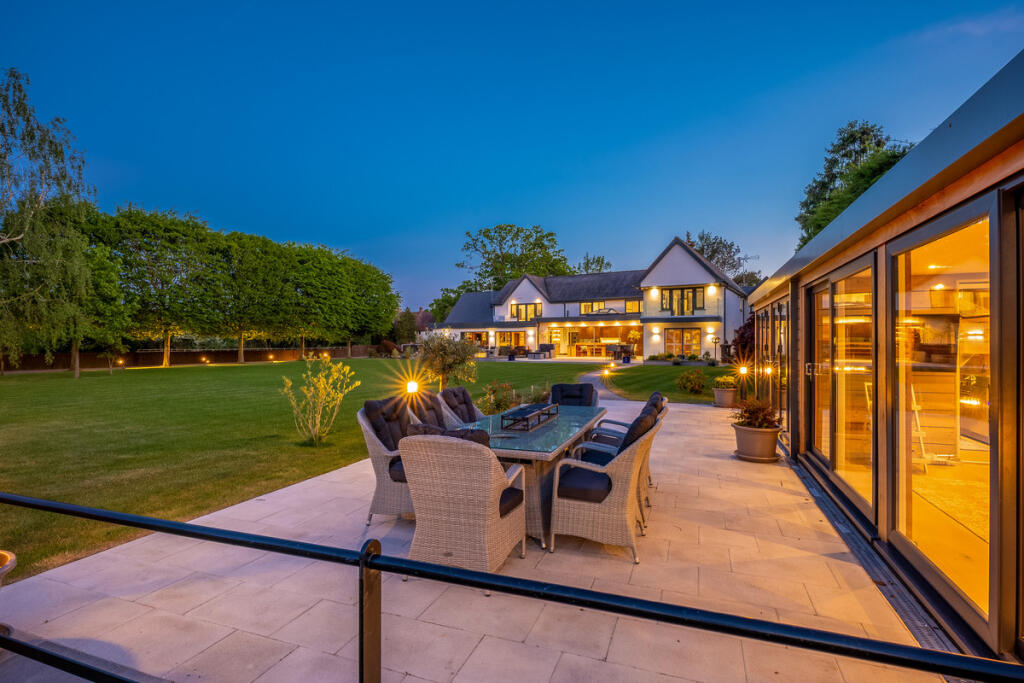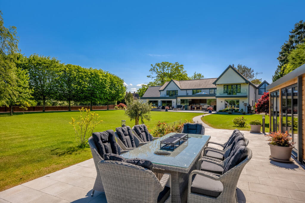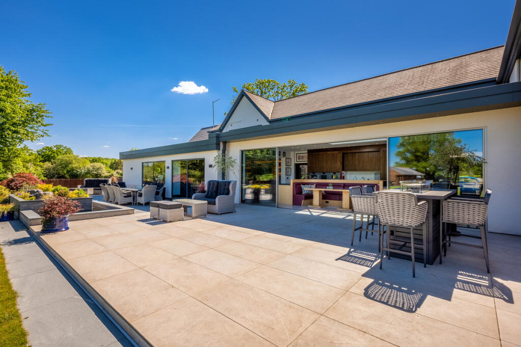 The wrap around patio to the rear of the property featuring raised flower beds and water feature can be accessed from all the reception rooms to the rear of the house connecting the spaces and making an wonderful area for entertaining and alfresco dining. A path then leads through the expansive lawned area to another patio area at the far end of the garden giving access to the garden room and its fully fitted garden kitchen, providing another wonderful space to enjoy the views and relax all year round.