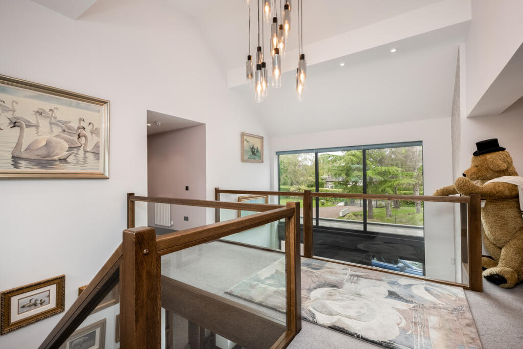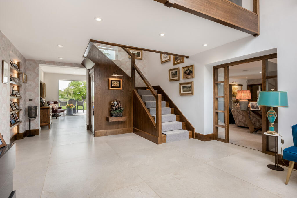 The spacious double height entrance hallway gives a glimpse to the luxurious finishes that are found throughout this property, with bespoke storage hand-built by Thomas Philpott and a galleried landing above this area is flooded with light from the glazed frontage.