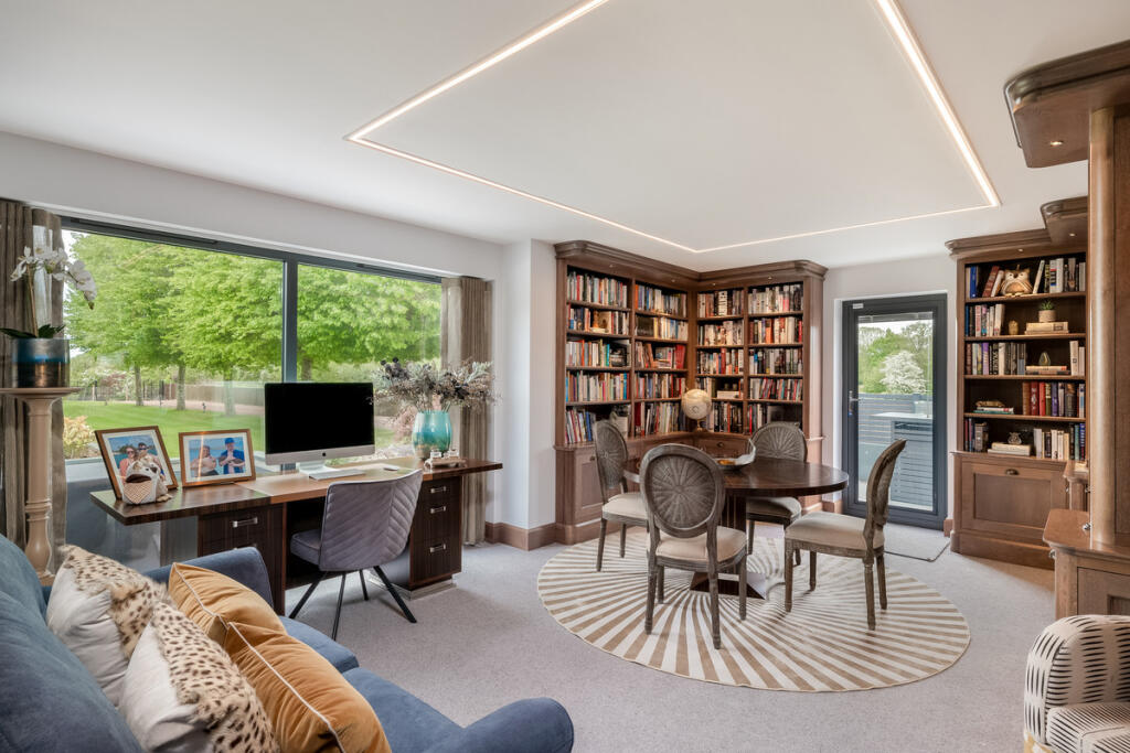 Leading directly off the main hallway is the wonderful open plan kitchen and family area. The bespoke hand-built kitchen by Thomas Philpott features a large central island with built in booth seating, granite worktops, induction hob and a wealth of built in appliances including Gaggenau ovens, six wine fridges, dishwasher and fridge freezer. This spectacular kitchen dining area is flooded with light from a light lantern above and a wall of glazing with sliding doors which open to connect this area with the fantastic entertaining area outside. To the right of the kitchen is the spacious family area with built in storage and display cabinets. This area is perfect for casual entertaining and leads through into another reception room which is currently used as a library with bespoke shelving units. This room also has direct access to the wrap around patio via sliding doors and a patio door to the side and access to the first of two double garages and a w/c, providing flexible living accommodation with multiple potential uses.