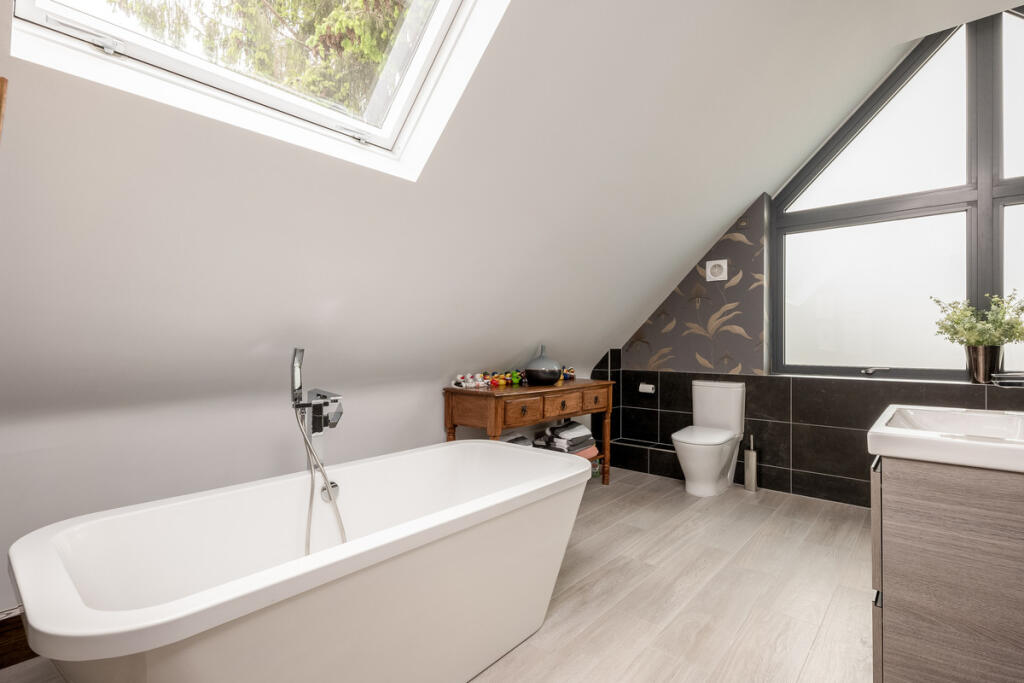 The fifth bedroom to the front of the property is of a very generous size with built in storage separating the room into a bedroom area and a separate seating area, perfect as guest accommodation or for those with extended family seeking semi-independent living accommodation. This room and its ensuite both feature skylight windows and beautiful feature windows following the shape of the vaulted ceiling and flooding the rooms with light.