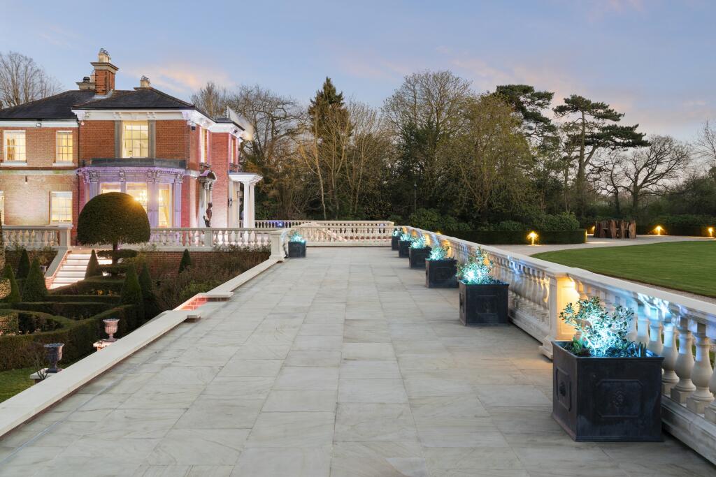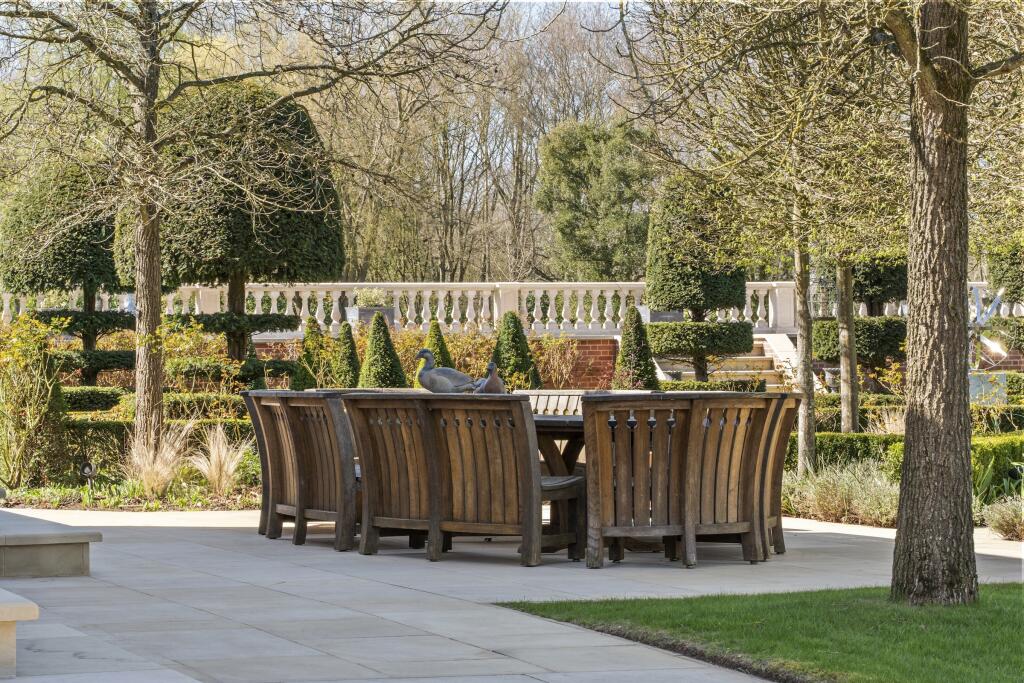 Outdoor living is equally impressive, with a wrap-around floating terrace offering serene views across the estate. The grounds include a private lake, kitchen garden, a dedicated children’s play garden, and a tennis court. Separate staff accommodation with its own entrance is discreetly integrated within the main house, while an additional three-bedroom guest or staff cottage sits beside the estate manager’s office.
