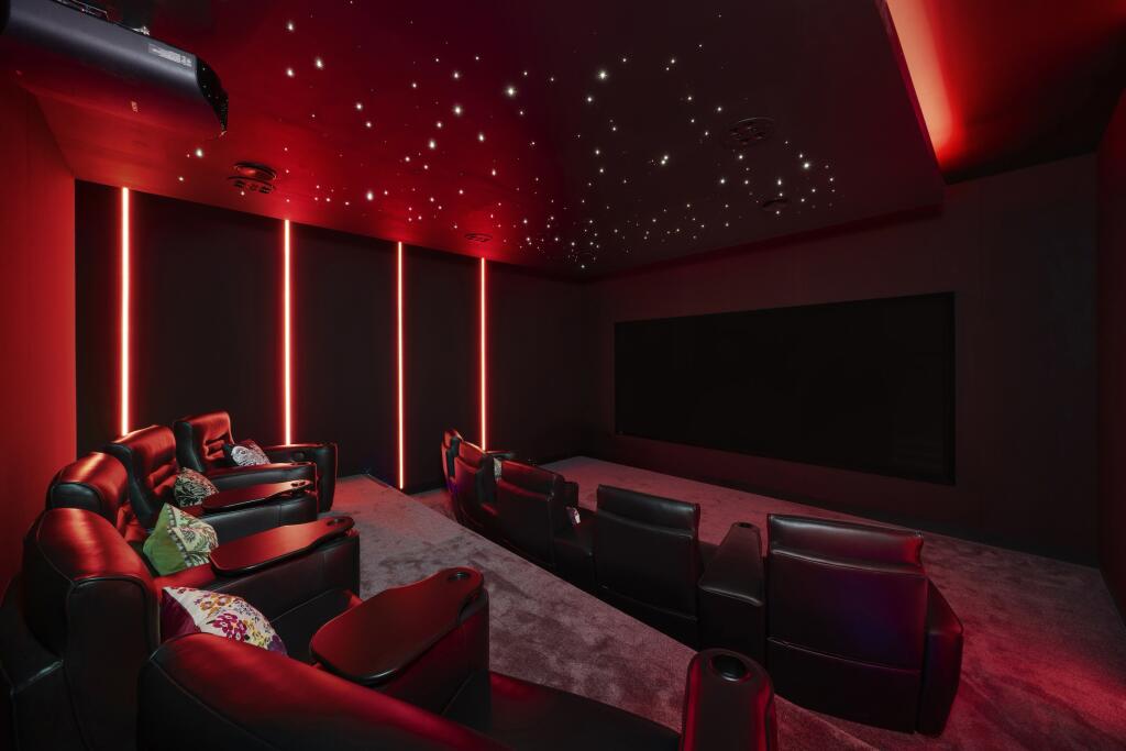 At the heart of the home lies a Charles Yorke-designed kitchen, complete with an Aga, Wolf range, Sub-Zero fridge/freezer, and Miele appliances. A discreet serving kitchen connects to the formal dining room, creating a seamless flow for hosting. The study, handcrafted by Linley, adds an additional layer of elegance and craftsmanship to the home’s bespoke finishes, which are enhanced by Rako designer lighting throughout.