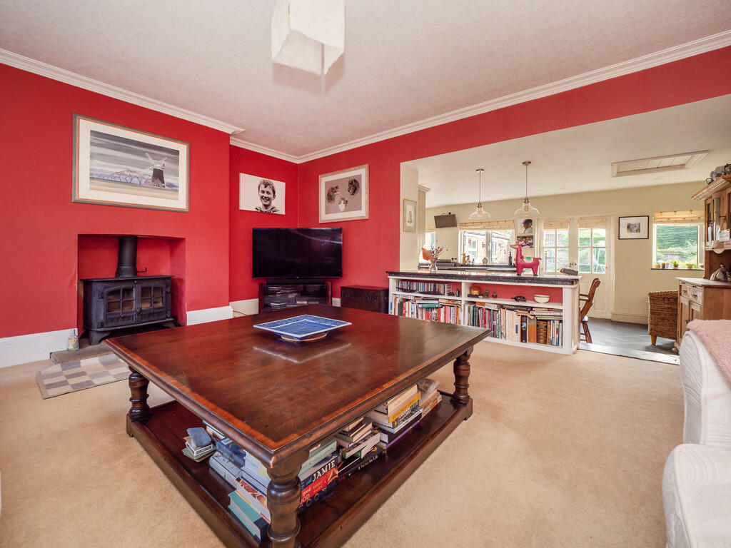 Through the door to the left lies what is, quintessentially, the heart of the home - a large sitting room with two windows to the front and a log burner. This semi-open plan elevated room has steps leading down to a bespoke fitted kitchen/breakfast room. The flow between these rooms creates a large yet cosy connected space, where one can relax in front of the fire without feeling isolated from the activity in the kitchen.