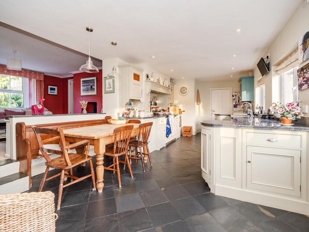 The craftsmanship of the "Kitchens Etc." bespoke kitchen is exceptional; boasting granite worktops, a butler sink, a classic electric AGA and a range of fitted cupboards, including two peninsula style units which provide extra worktop space. To one end of the kitchen is a large traditional style walk-in pantry which holds both a large fridge/freezer and a chest freezer, with sufficient marble shelving for all your provisions - a kitchen and pantry designed for those who love to cook.