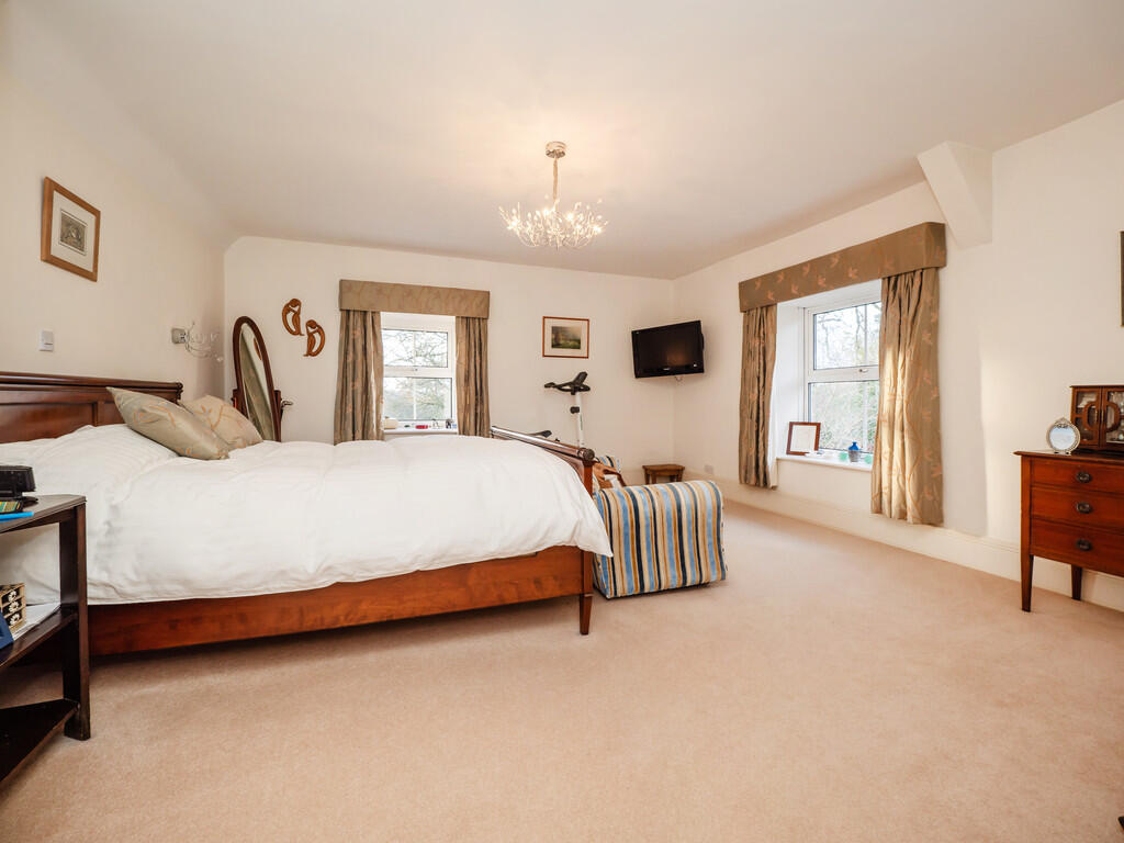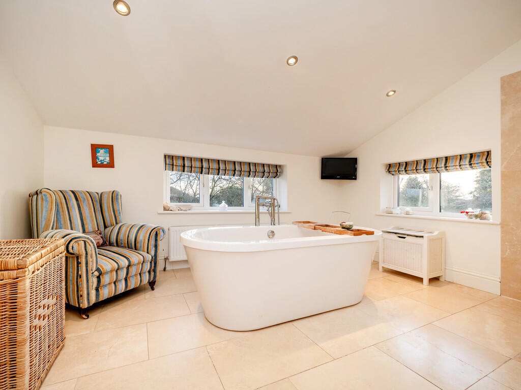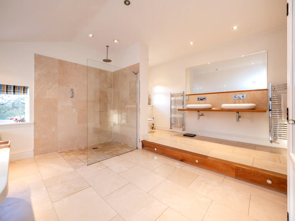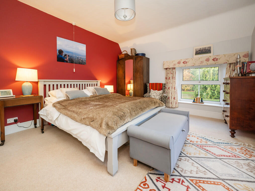The upper floor accommodates five bedrooms and the family bathroom, as well as two ensuites and a large dressing room. Four of the five bedrooms are generously sized doubles, with the guest bedroom benefitting from its own en-suite. The principal suite, however, is something truly special. Flooded with natural light thanks to its dual-aspect windows, the bedroom retains nods to its past, including a capped wrought iron fireplace. The extension enhances this suite, offering a sense of luxury - with a 12ft dressing room and a beautifully designed en-suite. The en-suite itself is a sanctuary, featuring a freestanding, central bath that makes the most of the scenic views, an open walk-in shower, his-and-hers sinks and electric underfloor heating - creating the perfect space to relax at the end of the day.