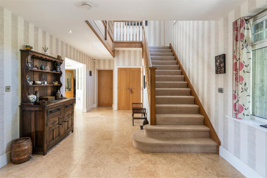 Set behind electric gates on a quiet lane, the property enjoys an impressive frontage with a large gravel driveway providing ample parking and access to a detached barn-style double carport. The carport includes a useful storage room and a versatile first-floor space, ideal as a playroom, studio or home office.