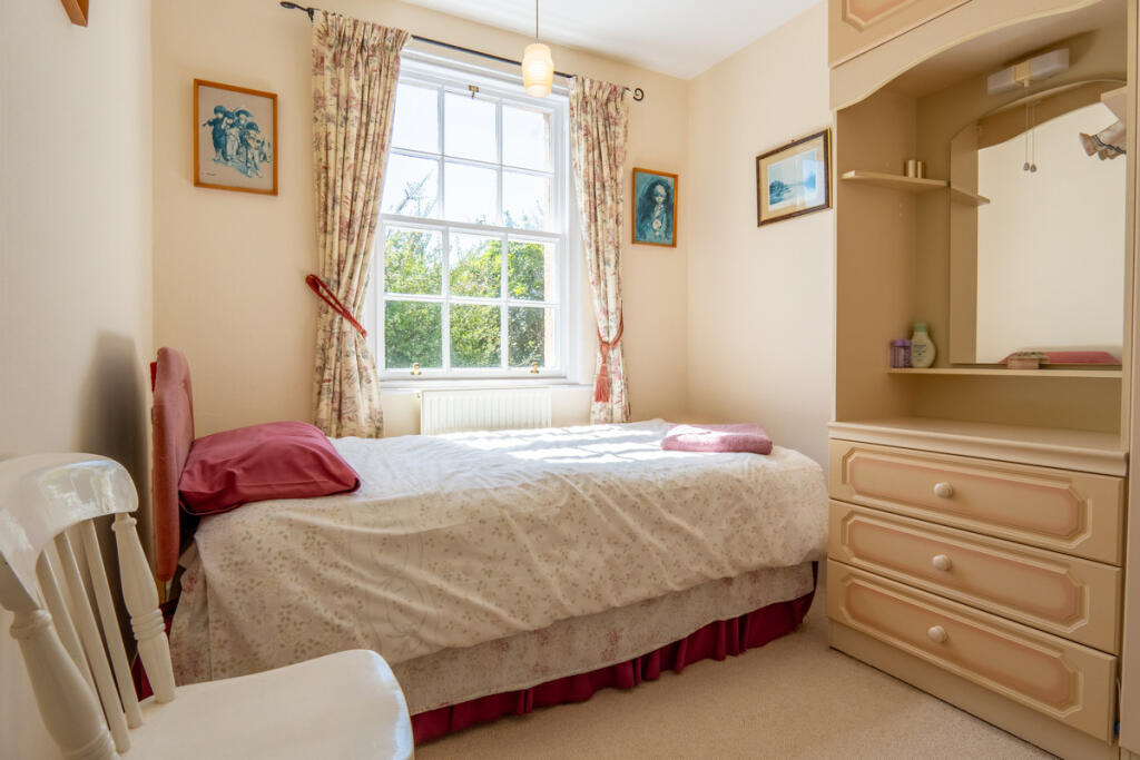 its own distinct character. Soft purple walls, a pale green carpet and a wide layout make this room feel inviting and well-balanced. There’s ample room for furniture and the single window overlooks the gardens, while a radiator can be found opposite the door.