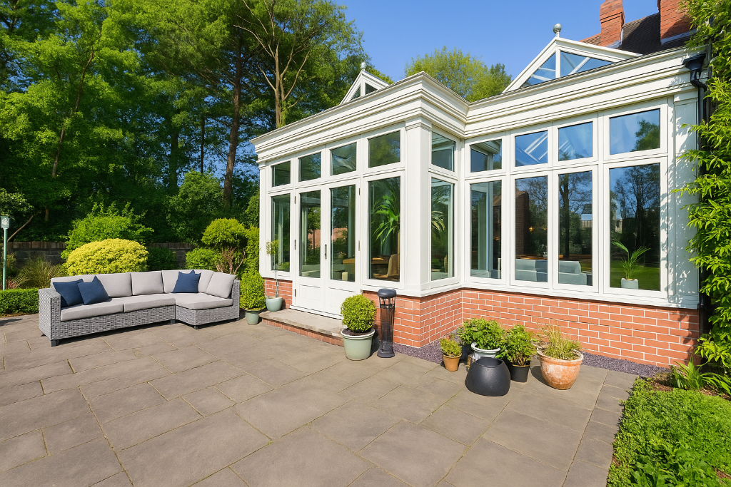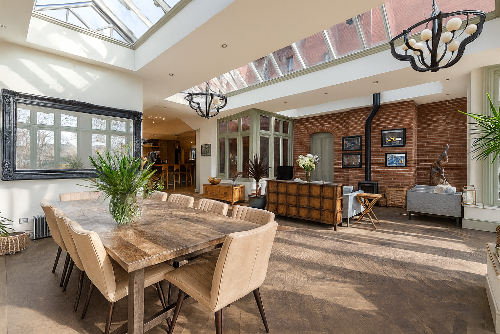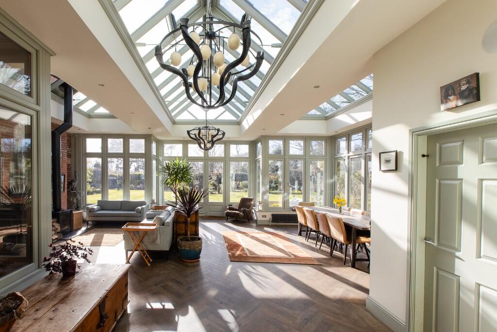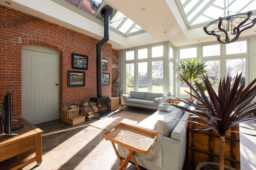 Rounding the corner, the newly built hardwood orangery (David Salisbury 2020) is an absolute showstopper. The three central peaks beautifully mirror the external design of the house and the views onto the garden are fabulous. The automatic vents in the roof control the temperature and shut when they detect any rain. This versatile space offers plenty of opportunity for entertaining friends and family or relaxing around the wood burning stove. The double doors open onto the garden creating an easy blend of indoor/outdoor living.