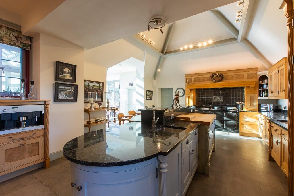 The kitchen beyond is superb. Fitted by Mark Wilkinson with a large central dining island and granite worktops, it is of the highest quality. There are a number of high specification appliances including a four oven gas Aga, coffee machine and a separate steam oven.