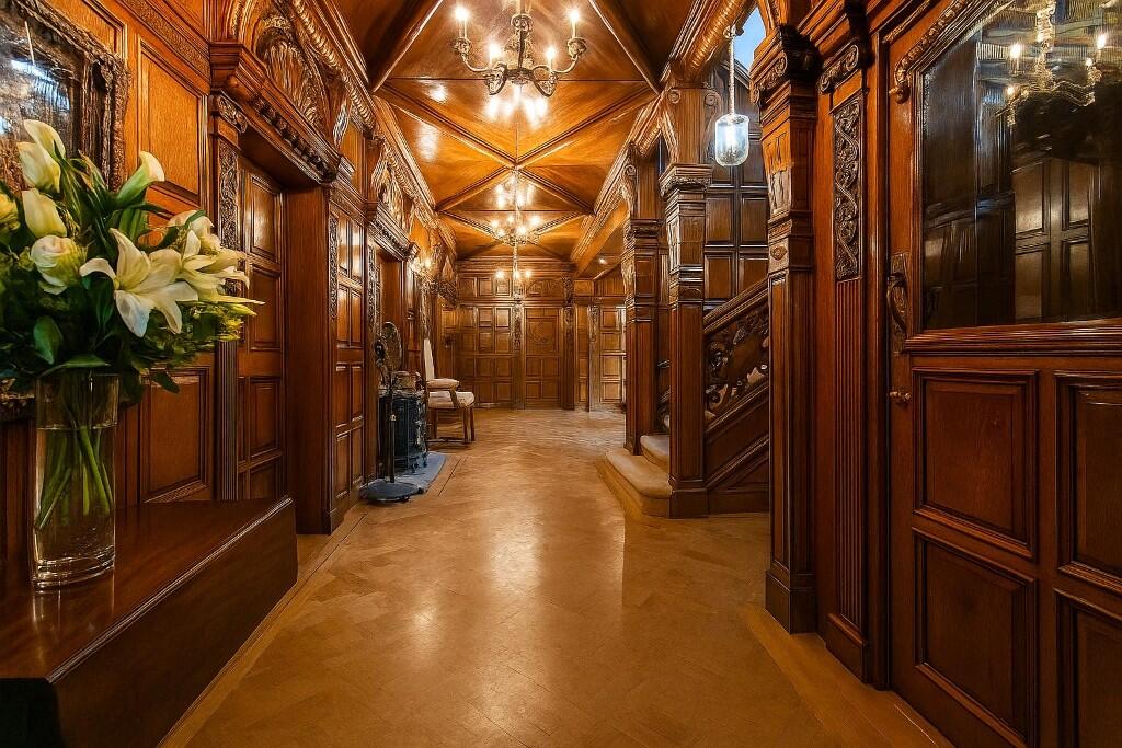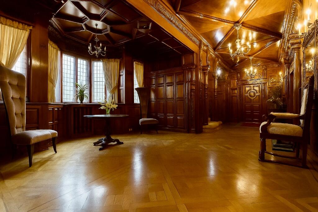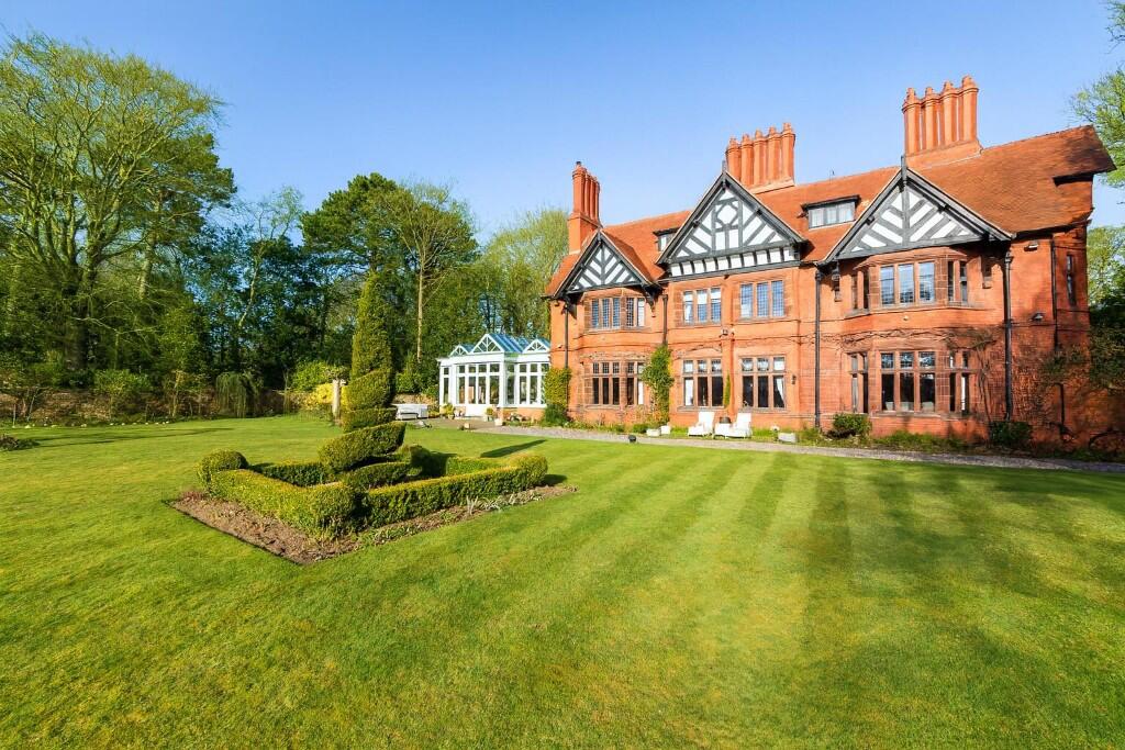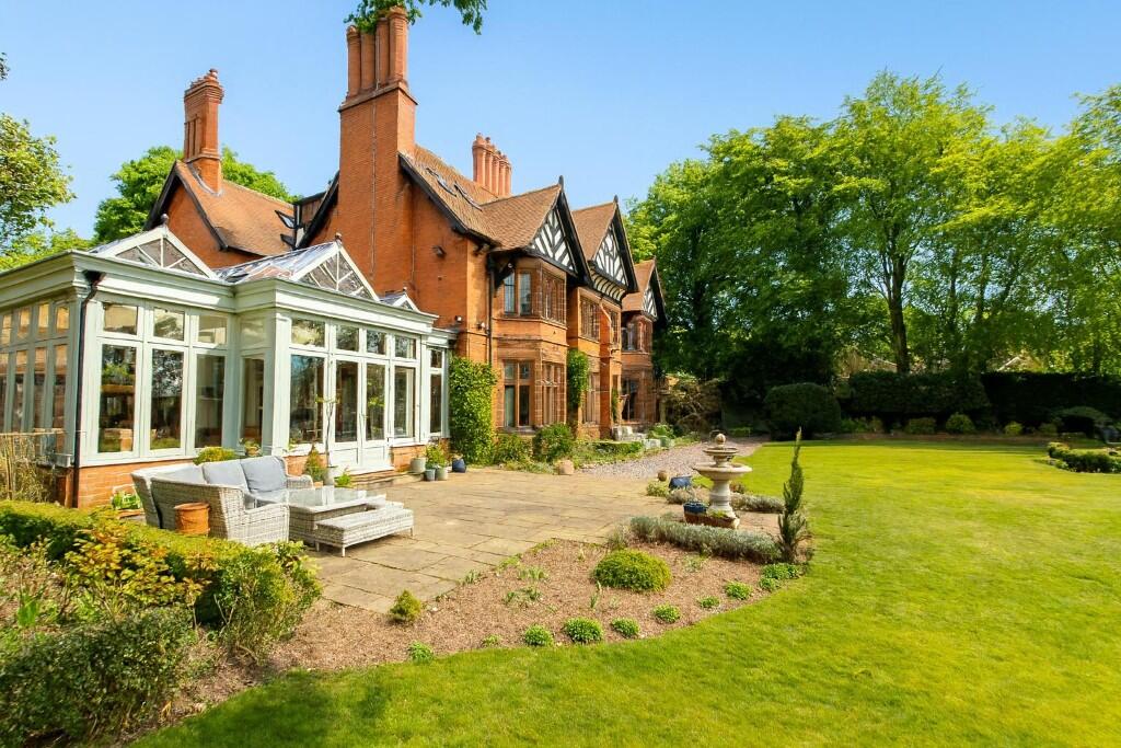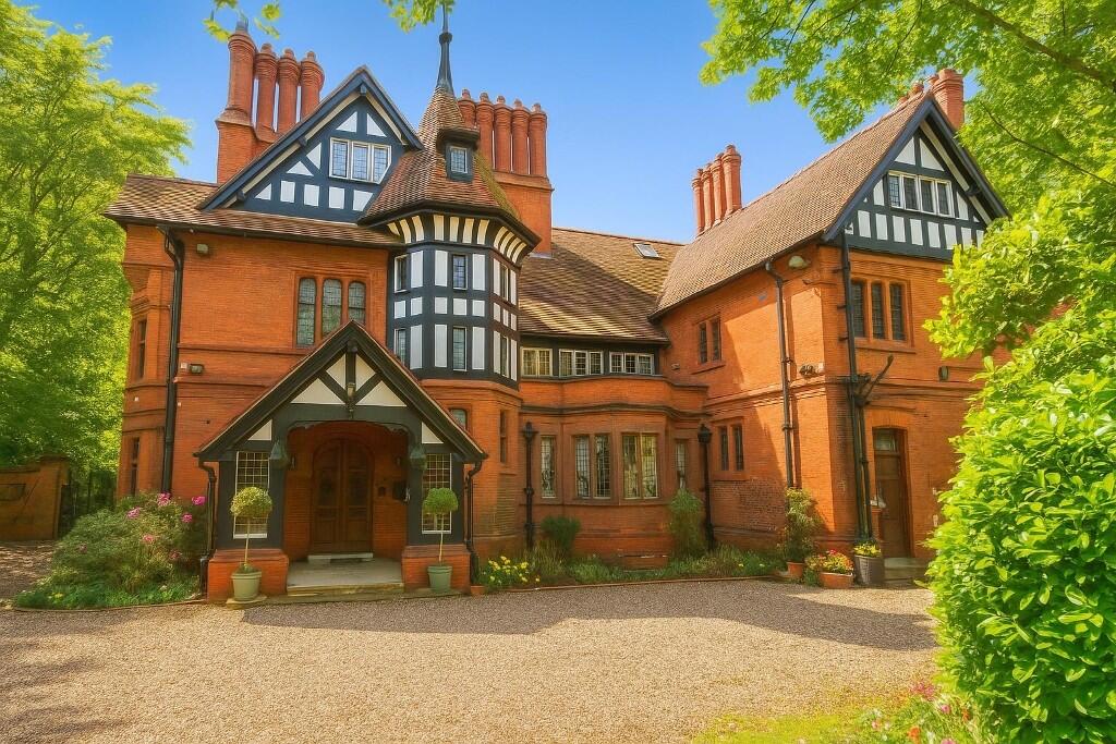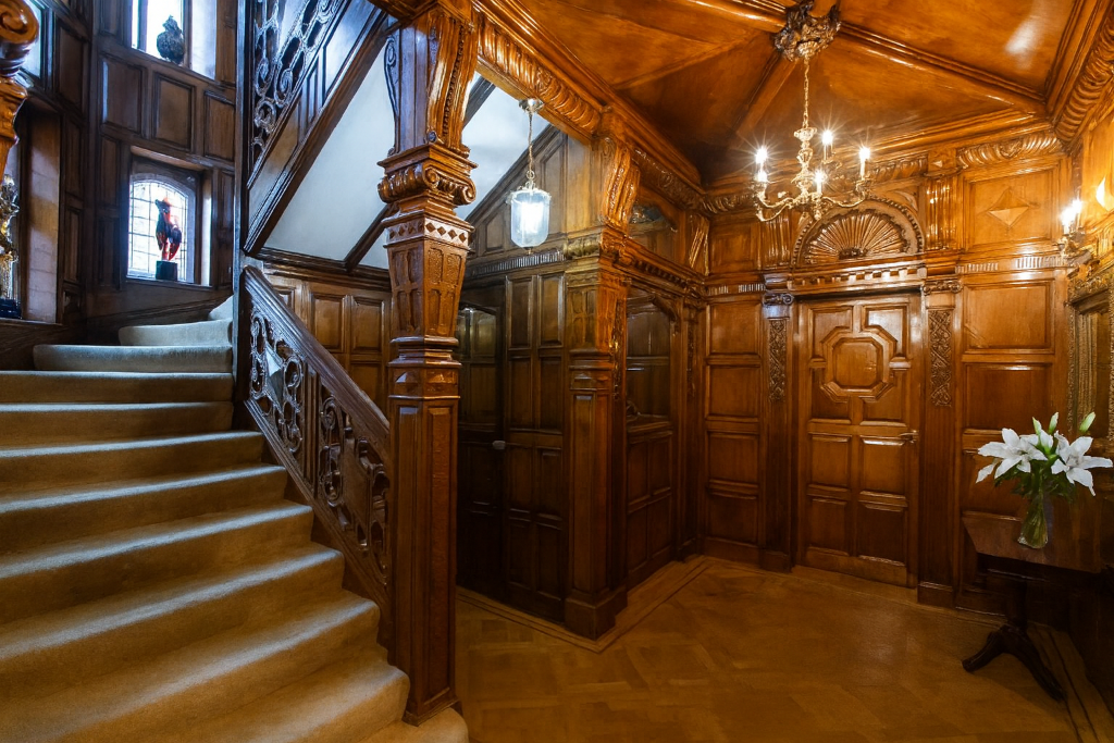 A Victorian house of Jacobean style, built in 1884 of brick with stone dressings, mullioned windows and timbered sections. Much of the original detail survives including the Jacobean style wood panelling throughout the entrance hall and up the octagonal spiral main staircase. It is Grade II listed and considered one of the best examples of the work of renowned Liverpool architect Edmund Kirby.