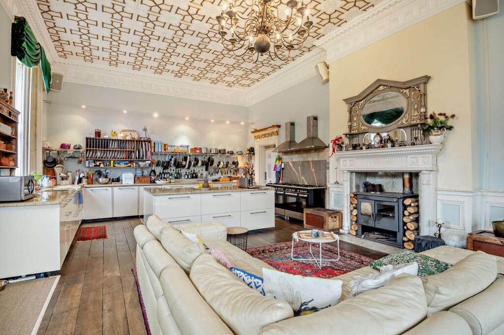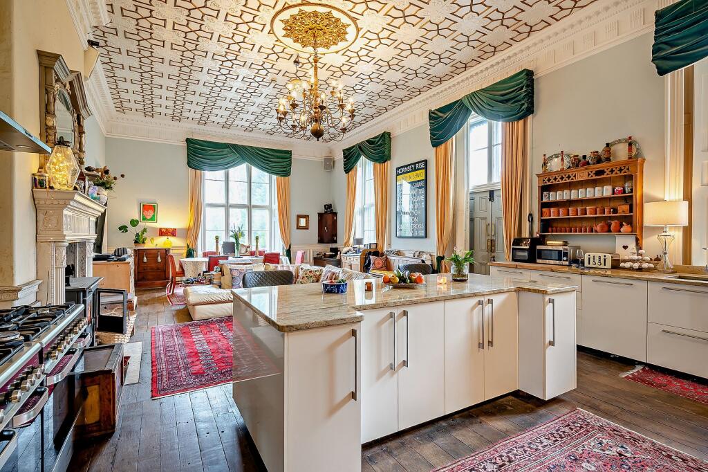 The formal reception rooms include a double aspect drawing room with a multifuel stove and a striking granite bar, a nod to its former life as a hotel, and a dining room with a working fireplace and garden views. The kitchen, once the ballroom, is now a stunning large family space with granite worktops, a double Range oven, two dishwashers, a central island and a wood burning stove. Ornate plasterwork, gold-painted ceilings and decorative coving add to the sense of grandeur.