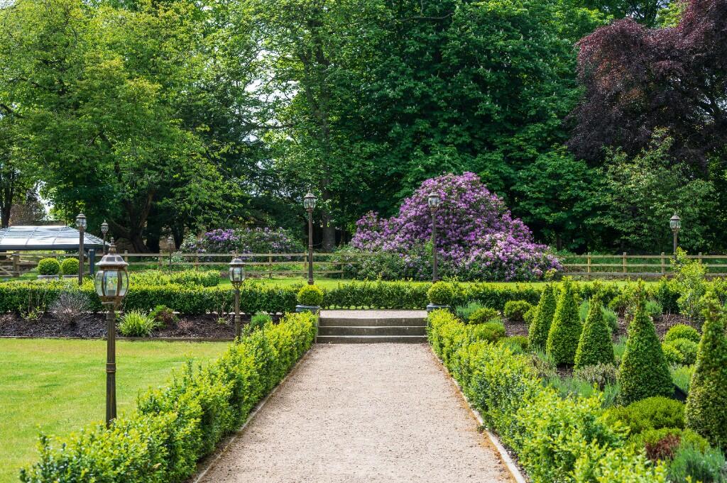 The formal gardens feature manicured lawns, box hedging, colourful borders, and large terraces ideal for al fresco dining. The Gogar Burn runs through the grounds, crossed by a Grade C Listed bridge, believed to have been designed by the artist Alexander Nasmyth.