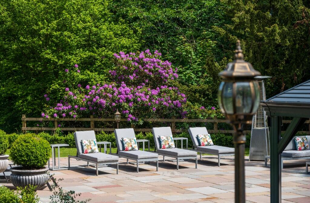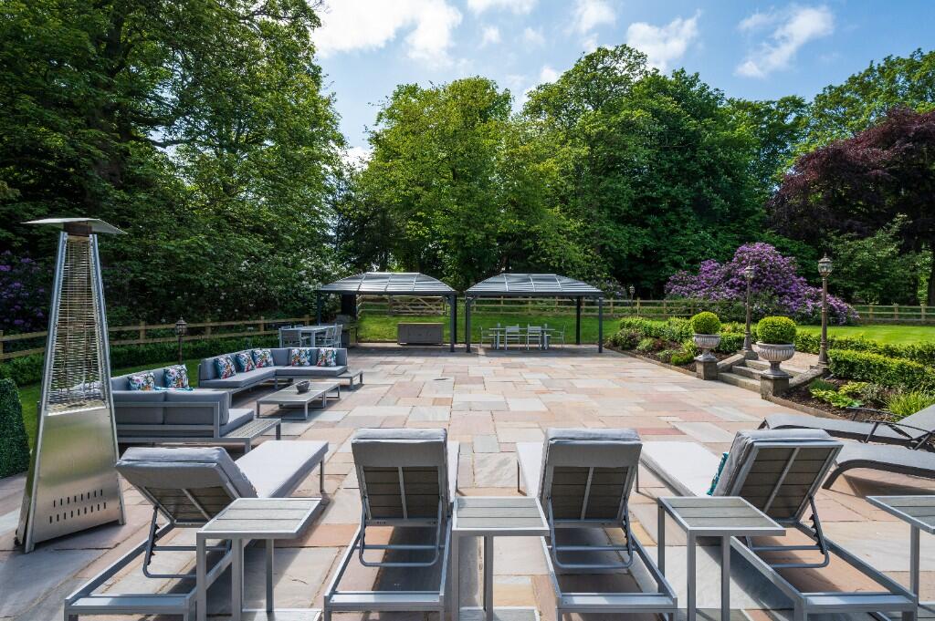 Set within approximately 15 acres of mature grounds, including woodlands, fields, a waterfall, and a stream, the estate offers complete peace and privacy. A long private driveway leads through a gated entrance, over a charming stone bridge, to a turning circle with a fountain and extensive parking.