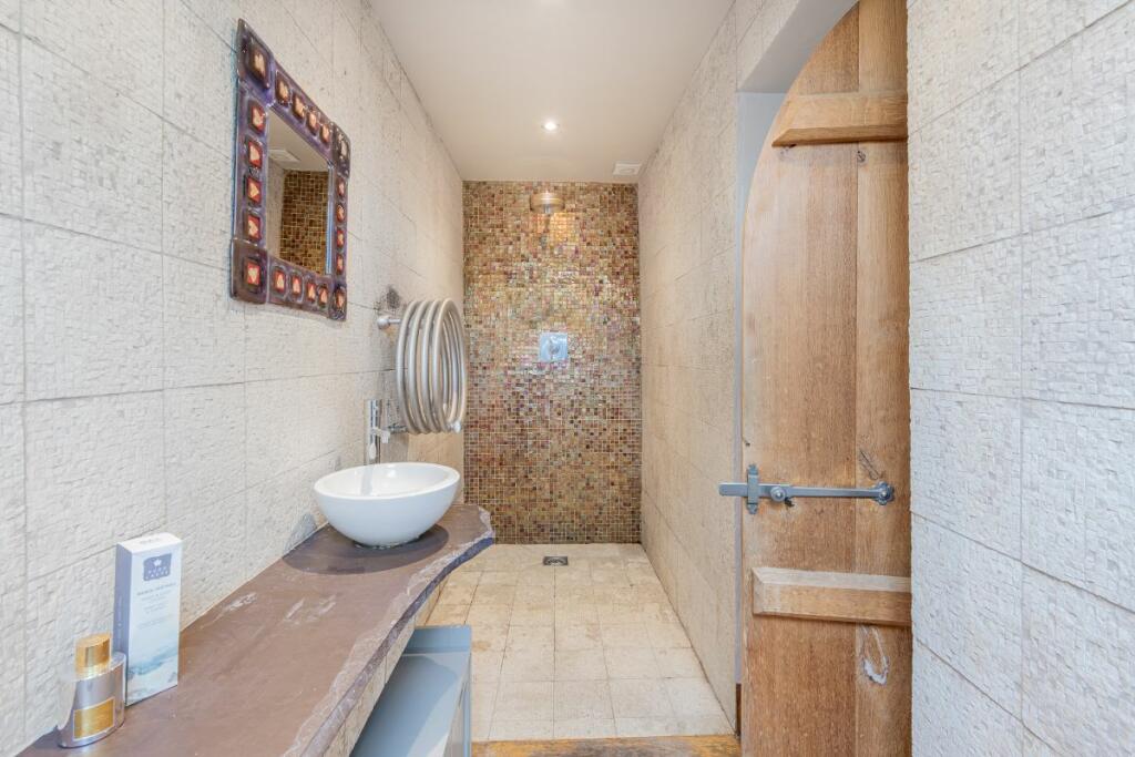 Make your way into the en-suite, comprising Fired Earth tiles with decorative mosaic feature tiles in the walk-in shower, it's a spa-like sanctuary. Also featuring exposed beams and skylight, a WC and wash basin.