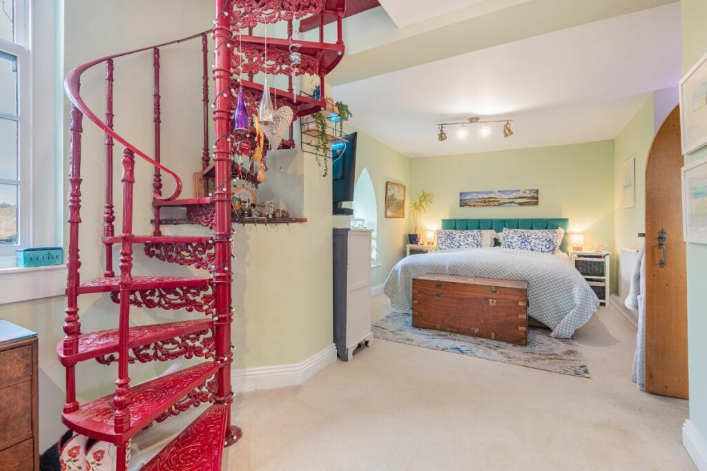 Turn left into a large mezzanine bedroom with fitted bespoke wardrobes and curling staircase leading to an upper floor that takes advantage of the high ceiling.