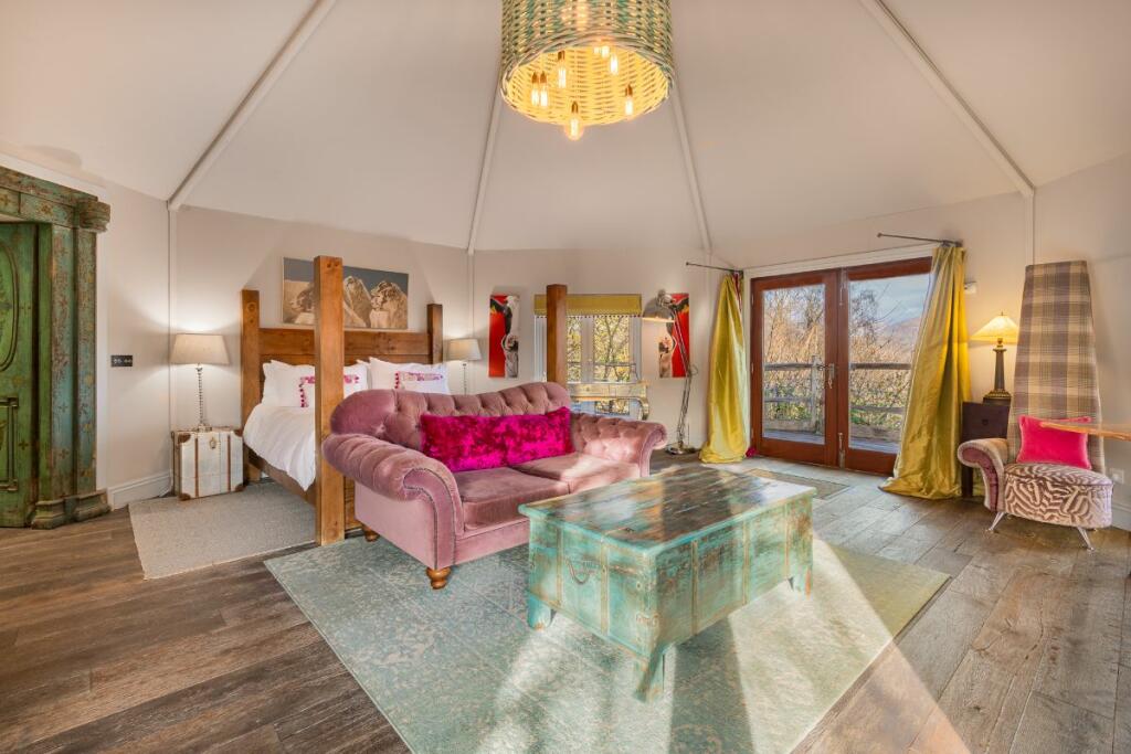 With its peaked roof, amazing views and domelike shape, this spacious suite is the epitome of luxury. Step through to the large bathroom, with copper bath, large walk-in shower, WC and dual wash basins.