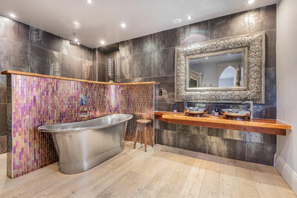 Take the door at the far end of the room to return to the entrance hall and discover the bathroom next door. Fill the large, freestanding roll top bath with bubbles ready to wash away all your cares. The bathroom also comprises a washbasin, tall Gothic window and heated towel rail.