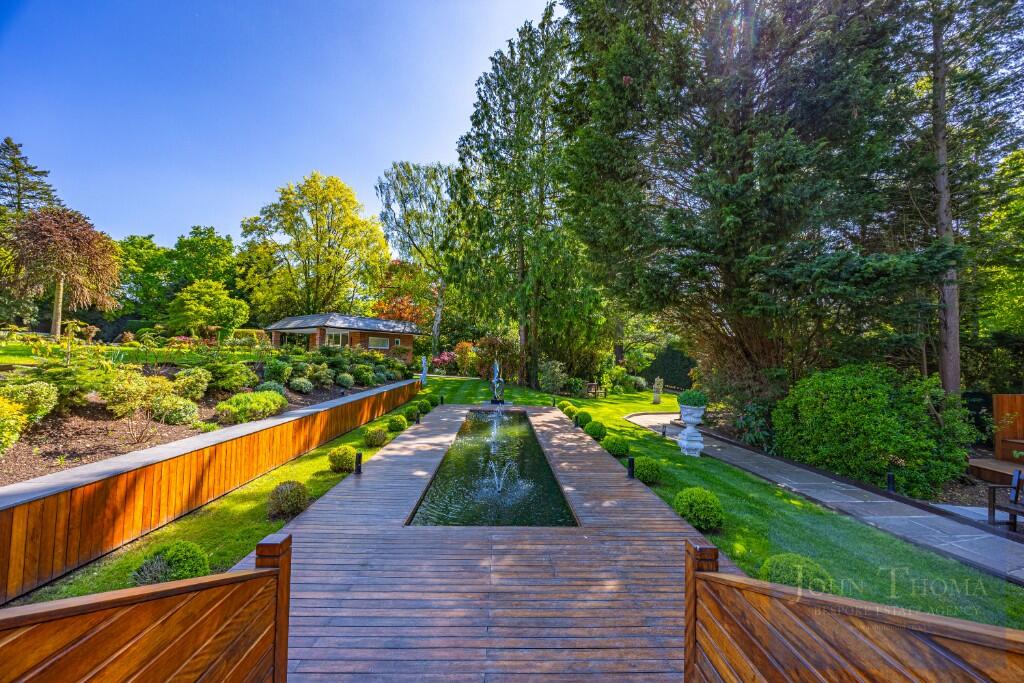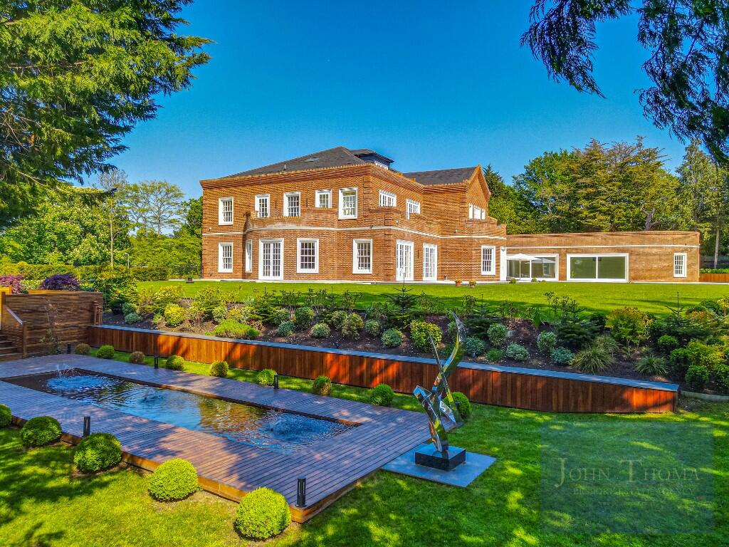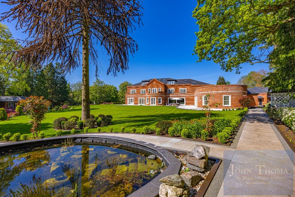 To the rear, there are beautiful south-facing landscaped gardens designed to offer both privacy and tranquillity with mature planting and sweeping views. The rear garden includes two separate water features, several entertaining areas, porcelain-tiled terraces, a summer house with kitchen and bar together with a large, separate decked area. There is also a cosy seating area with a fire pit perfect for autumn evenings. To the rear of the garden is a tennis court hidden away. This circa 4-acre plot provides total seclusion.