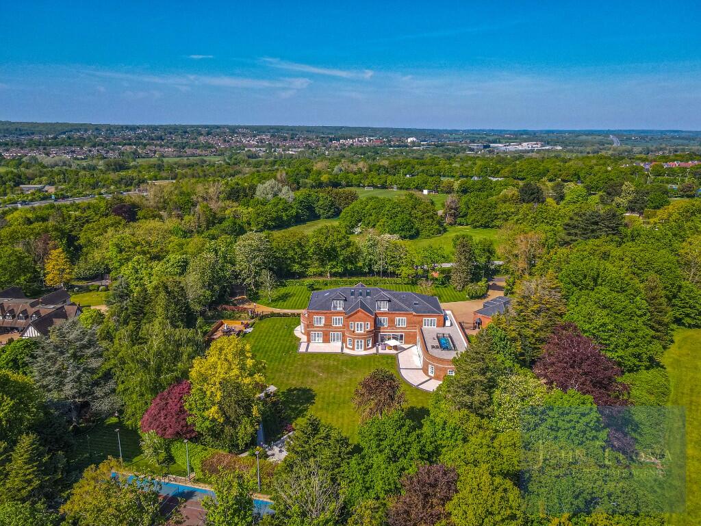 This discreetly located house is entered through wrought iron electric gates onto a sweeping resin bound driveway with granite kerbs. The substantial front garden has mainly laid lawn with a fountain as its focal point. An extensive triple garage provides parking for several cars. In addition, there is parking for comfortably over 20 cars in the covered area behind the garages and on the driveway.