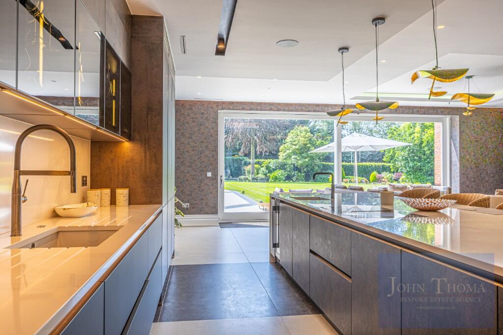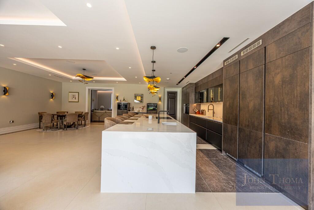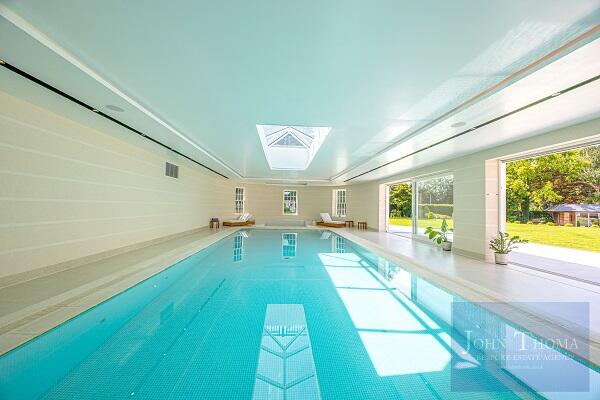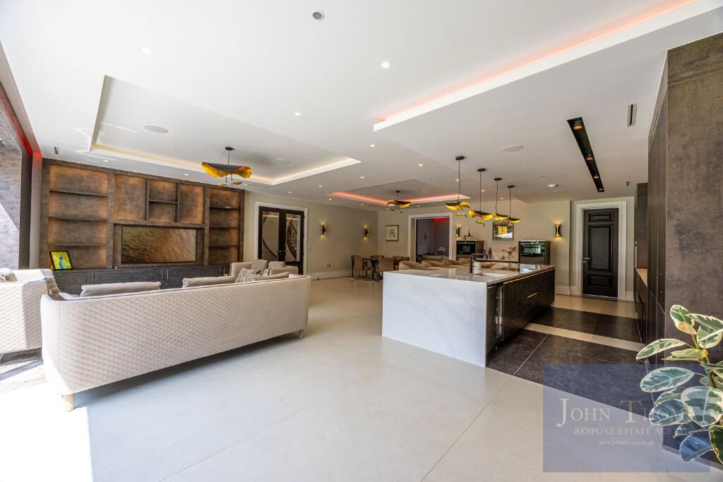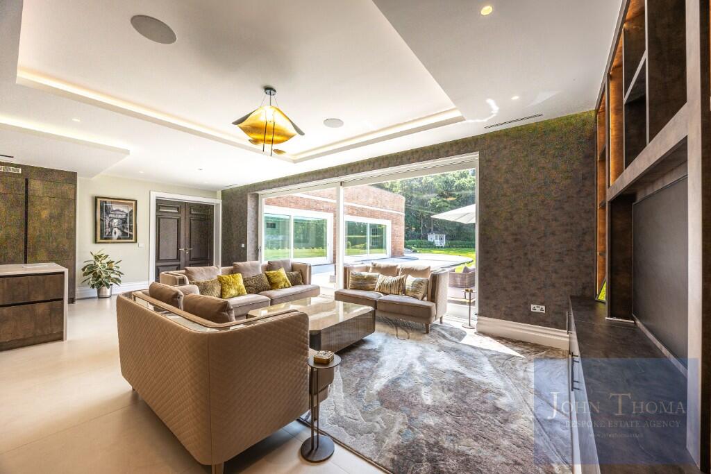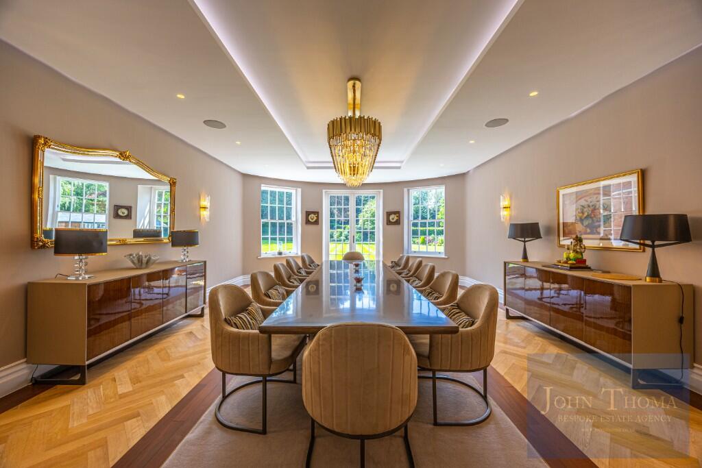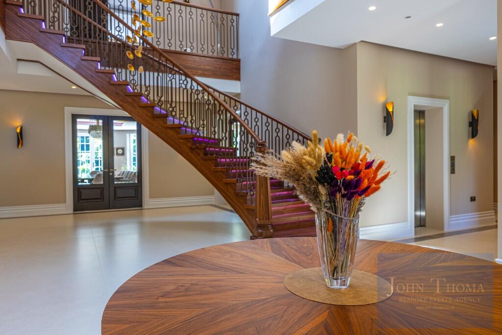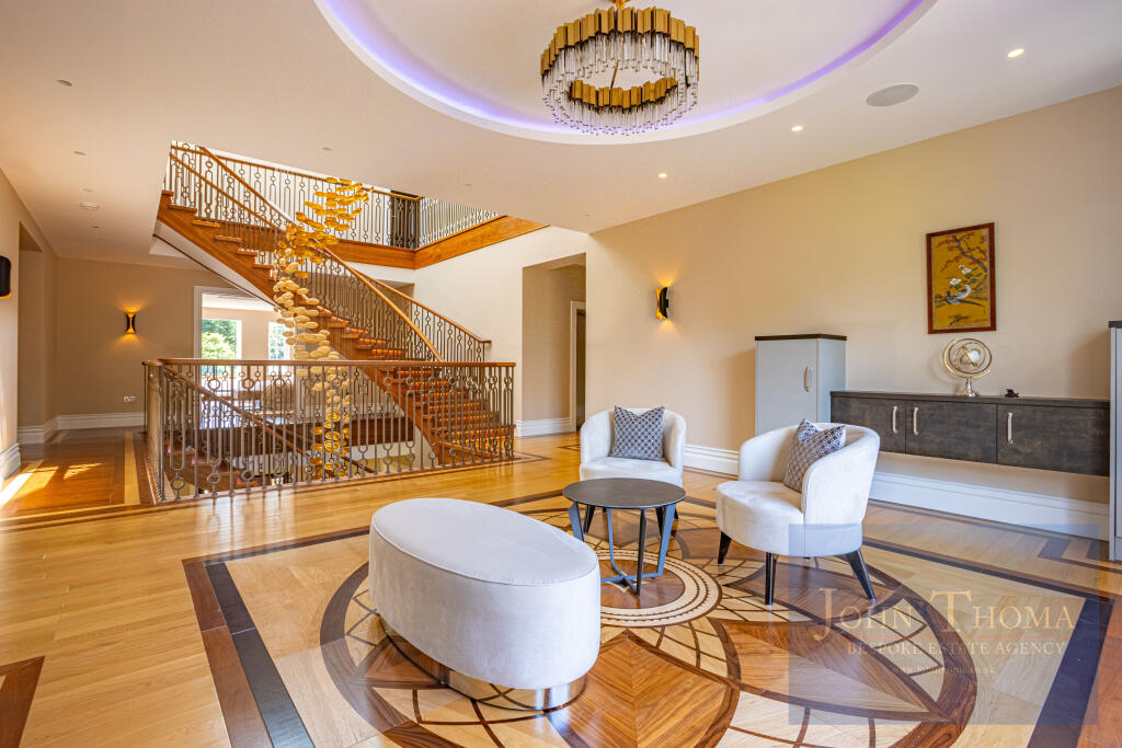 Beyond the imposing exterior, lies a sophisticated and luxurious interior where craftsmanship, technology and comfort seamlessly combine. Upon entering the house through the 2.4m high double doors you are greeted by a grand bespoke, walnut staircase and galleried entrance hall being a perfect setting to welcome guests. This leads to formal and family areas of the home. In addition to the lounge with library, wine room, formal dining and study there is also a huge family room with bespoke fitted kitchen, breakfast bar, family dining and relaxing areas. Further there is a tv room and separate fully equipped informal kitchen with breakfast bar. The spa complex, including a swimming pool, jacuzzi, sauna, steam room and treatment room, is also located on the ground floor.