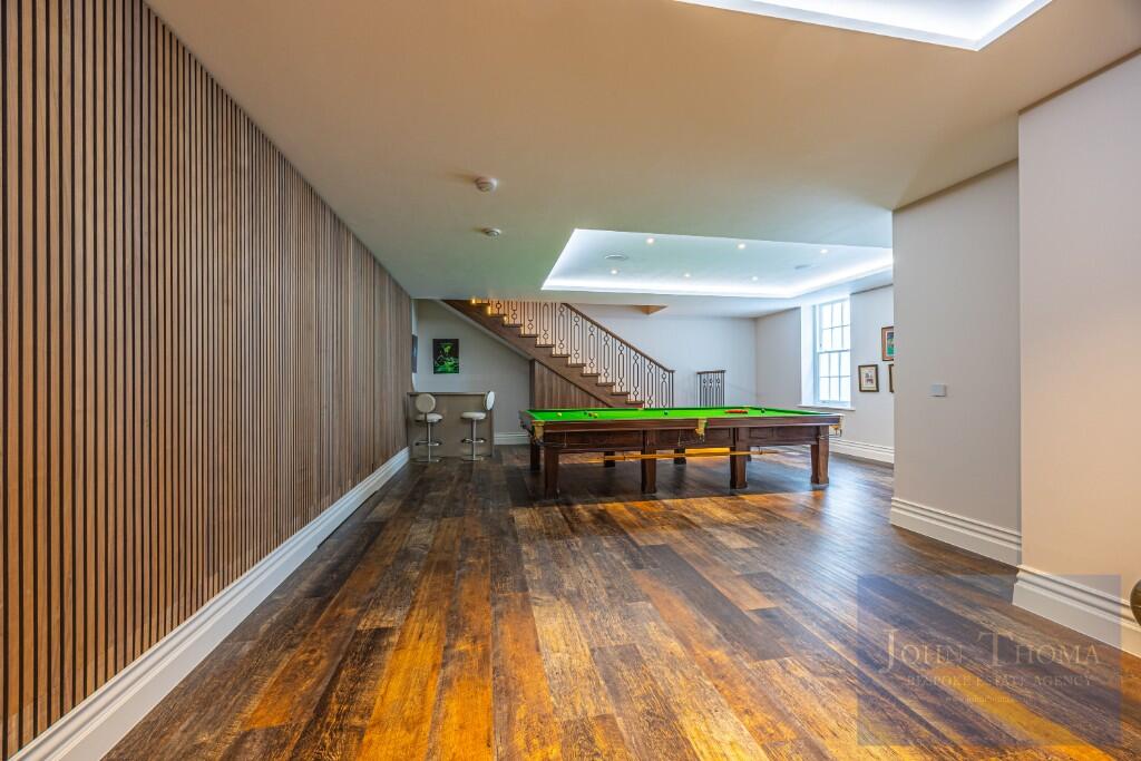 A beautifully lit walnut staircase leads down to the entertainment area, which features a full-size snooker table, areas for relaxing and games, a bar and guest cloakroom. Beyond the games room, through a secret revolving door, is an impressive cinema room with panelled walls and luxury seating. On the first floor, you will find a fully fitted gym with shower facilities.