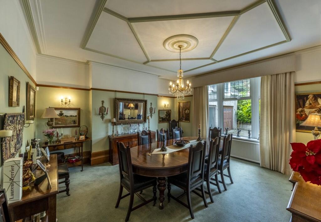 Opposite are the two front reception rooms. With a front bay window is the elegant drawing room with a marble fireplace flanked by alcoves. Adjacent is the formal dining room with a large window featuring leaded detailing and splendid decorative plasterwork on the ceiling. The dining room is large enough to comfortably fit 12 people.