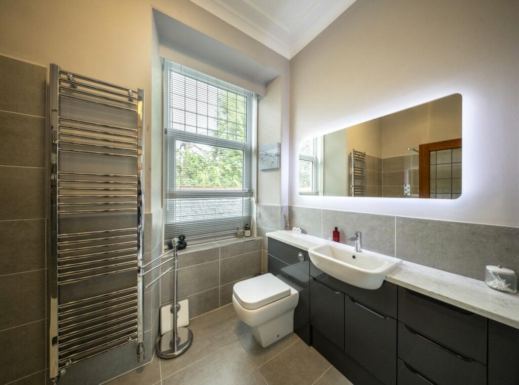 Entrance is via the stylish covered portico and the accommodation then begins with the original entrance vestibule which has been extended and features an original granite wall encased in solid wood panelling. This area has a cloakroom with WC and wash basin. An elongated hallway gives access to four of the main living spaces and at the end of the corridor is a further WC and wash basin with original window.
