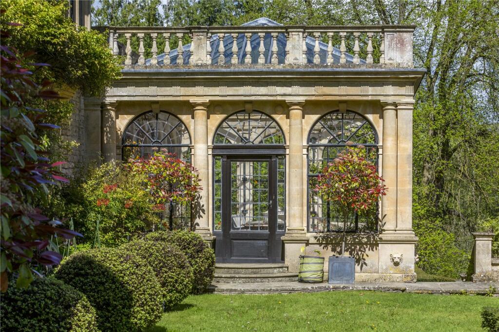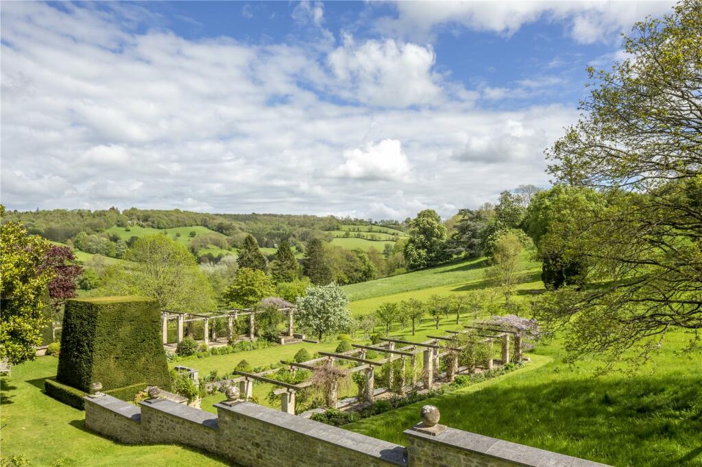 Rising from the west of the house, stone steps lead up to a long bowling green, Jacobean in origin, bordered by stone balustrades and an arching avenue of ancient yews. Myriad lawns and terraces are connected via ancient stone stairways and long pergola gravelled walkways, festooned with wisteria and roses. Ancient sentinel and topiaried yews border deep and abundant herbaceous flower beds. An apple orchard is situated beside an avenue of flowering cherry trees, creating a long vista from the grass terrace below the ballroom. With its stone balustrades and matching flights of stone steps to the lawns below, this forms a theatrical backdrop to the formal gardens. To one side is the stunning orangery, added in the 20th century. Wildflower and pasture meadows border the gardens to the east, south and west. A tennis court is situated on the other side of the lane to the east with 2 stables at the top boundary. Mixed broadleaf woodland frames the spectacular valley to the south. In all there are about 13.78 acres.