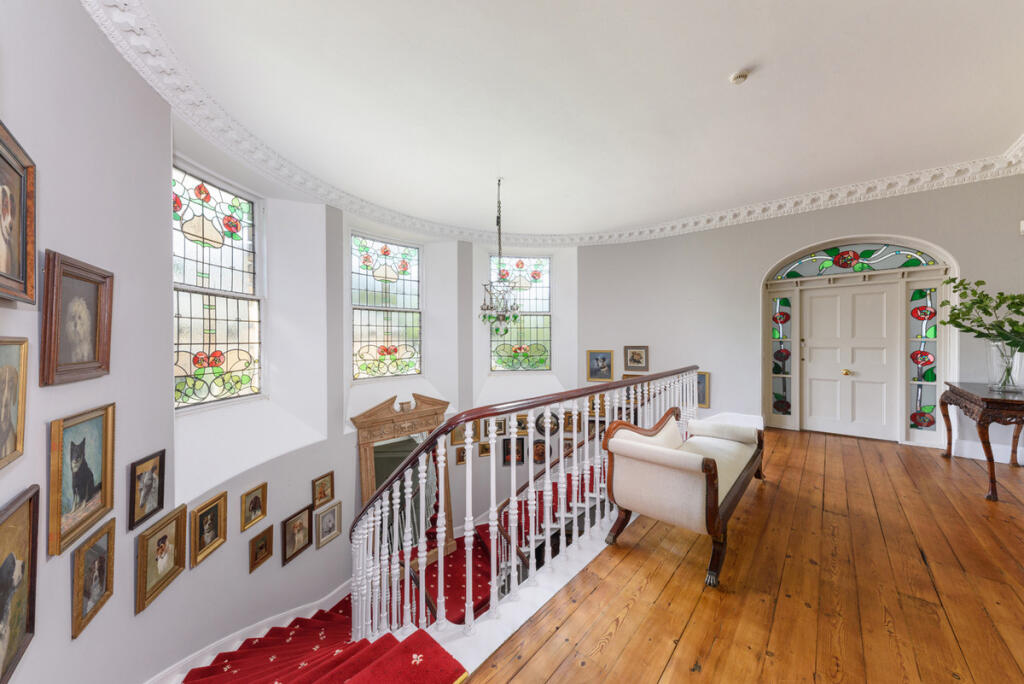 With flooring and highly decorative mouldings. Imperial staircase dividing on first flight; Multi fuel stove inset to marble surround; Two sash windows with shutters.