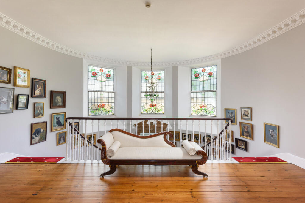 Three feature stained glass sash picture windows above over double flight of stairs leading to an open gallery beyond the landing. Two sets of doors, both with surrounding stained glass detailing, providing access to the east and west wings