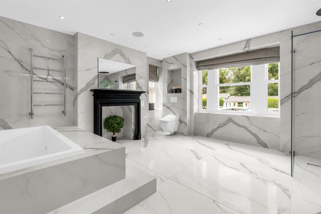 On the first floor, the master suite is nothing short of palatial. With a private salon complete with a fixed hairdressing chair, backwash basin, and massage room, it brings spa-level amenities into the heart of the home. The adjoining his and hers dressing rooms are exquisitely fitted, with the brown and white dressing areas designed with Smallbones of Devizes cabinetry. The master bathroom is finished in Porcelanosa stone, featuring a Jacuzzi bath, dual sinks, a walk-in shower, and a Japanese smart toilet, all framed by elegant porcelain tiling.