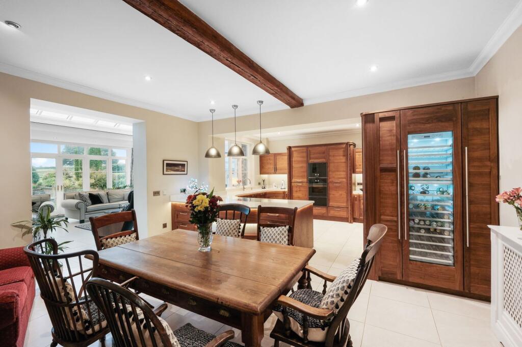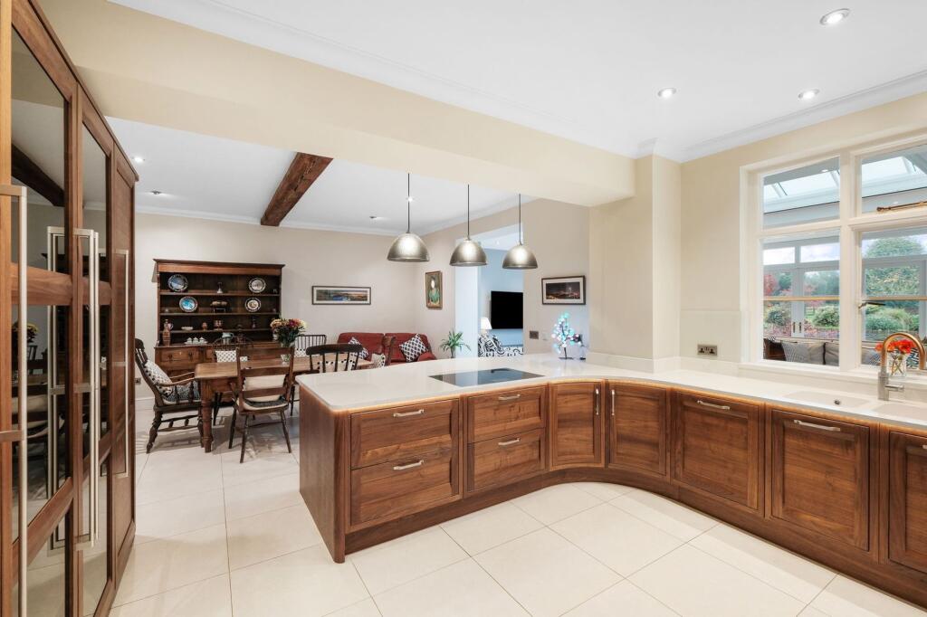 At the heart of the home, the kitchen diner and orangery offer exceptional comfort and style. Enhanced with underfloor heating, the kitchen, expertly designed by Culina and Balneo of Malvern, it boasts solid walnut cabinetry by Stoneham of Sidcup, Kent. A full suite of premium Gaggenau appliances includes a double oven, microwave and combi oven, plate warmer, dishwasher, fridge, freezer, and induction hob. A Siemens wine fridge and a boiling water Quooker tap further elevate the space.