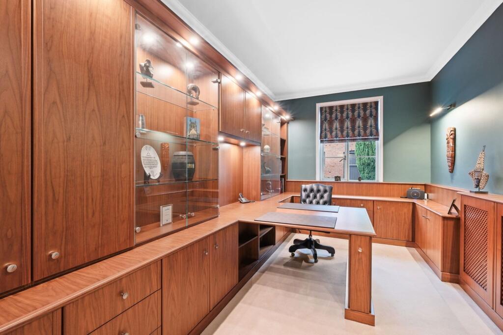 Beneath the main staircase lies the entrance to the tanked cellar, which mirrors the size of the drawing room above. Fully carpeted and fitted with power and radiators, this space offers generous storage and the potential to serve as a games room or home cinema. Continuing through the house, the rear hallway leads to a well appointed kitchen diner, cloakroom, study, and rear porch. The downstairs cloakroom showcases period charm with a Victorian style toilet and sink. The newly renovated study features bespoke cabinetry and a fitted desk designed and installed by Strachan of Leeds.