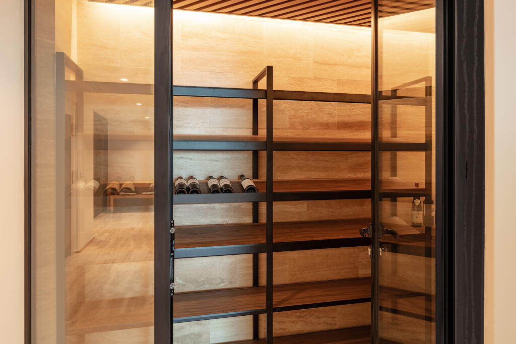 Lower Level: Unmatched Wellness and Entertainment The villa's lower level is a private retreat for wellness and leisure. This space features an indoor pool with counter-current functionality and unique glass portals that offer views into the outdoor pool. A Turkish bath, sauna, gym, and custom wine cellar complete the experience, creating a spa-like oasis that is second to none. A sleek bar and lounge area further elevate this level as the ultimate entertainment hub. The lower floor also includes a garage with space for three vehicles, accessible via both stairs and an elevator.
