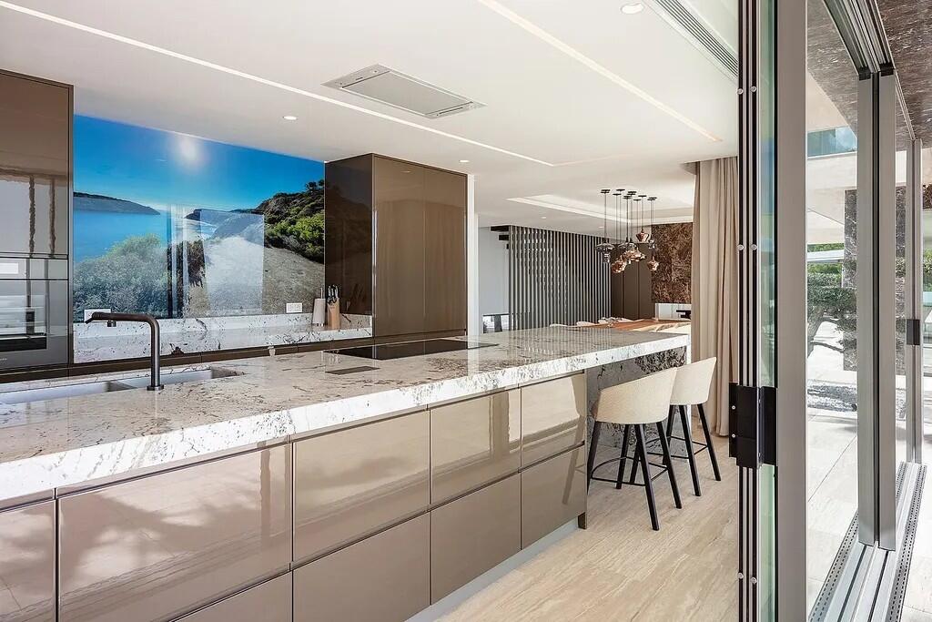 Main Level: The Heart of the Home As you enter the property the front door opens to frame the dazzling Mediterranean vista before you. The main floor is a vision of open-concept luxury, featuring a vast living area with custom marble accents, a built-in TV, and a contemporary fireplace. Adjacent is an elegant dining space, illuminated by designer lighting fixtures, and a state-of-the-art kitchen outfitted with sleek cabinetry, premium Miele appliances, and a sprawling marble island that invites culinary creativity. Floor-to-ceiling windows blur the boundary between inside and out, allowing natural light to flood the space and offering constant sea views. From the main living area, step out onto a stunning terrace designed for entertaining and relaxation. The centrepiece is a magnificent 12x4m heated infinity pool with in-pool loungers, a sunken lounge, and a jacuzzi, all positioned to maximise the views. To one side, a summer kitchen with a built-in BBQ and alfresco dining area under a retractable shade pergola offers the perfect setting for hosting guests. On the other side, a chic chill-out lounge invites you to unwind, shaded by a contemporary pergola.