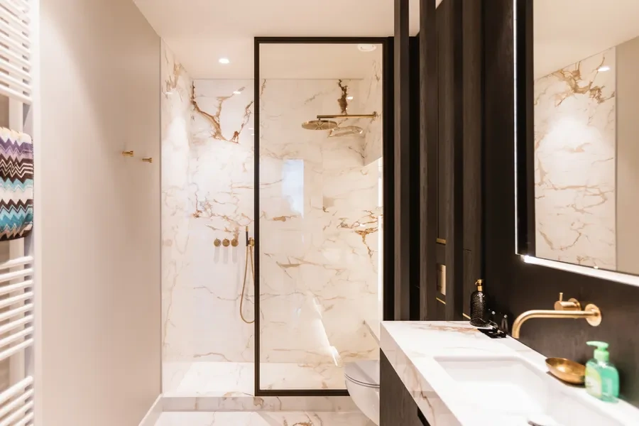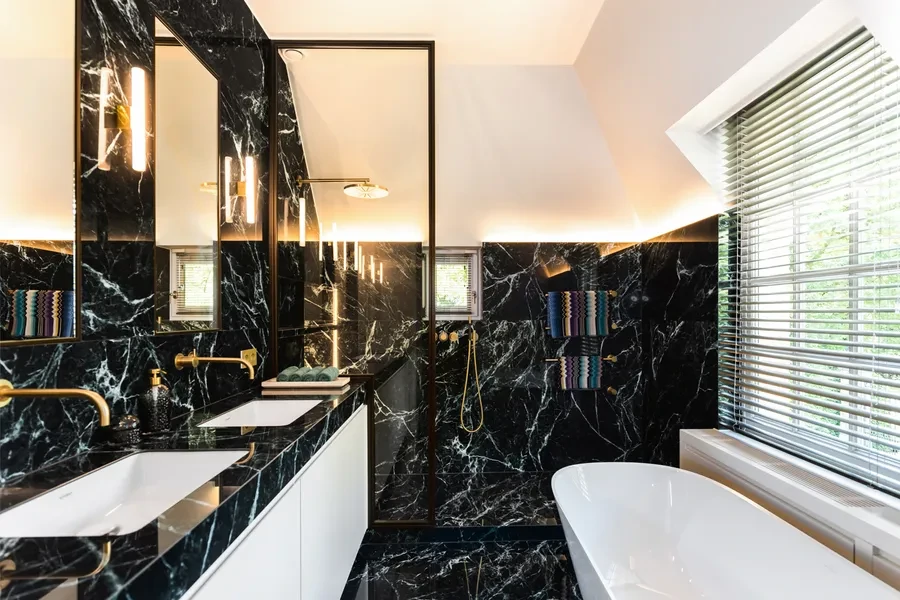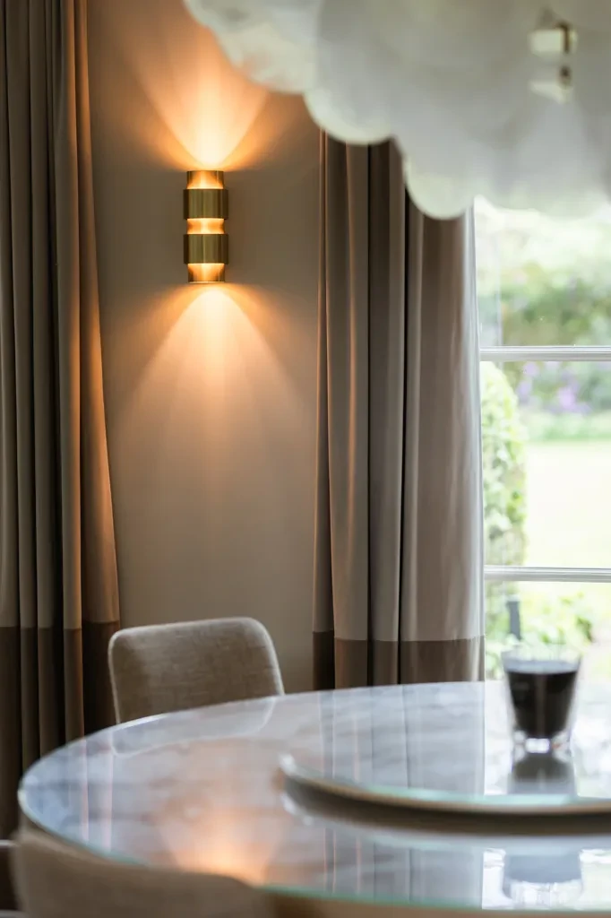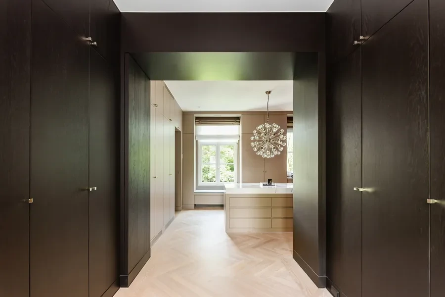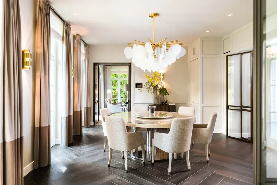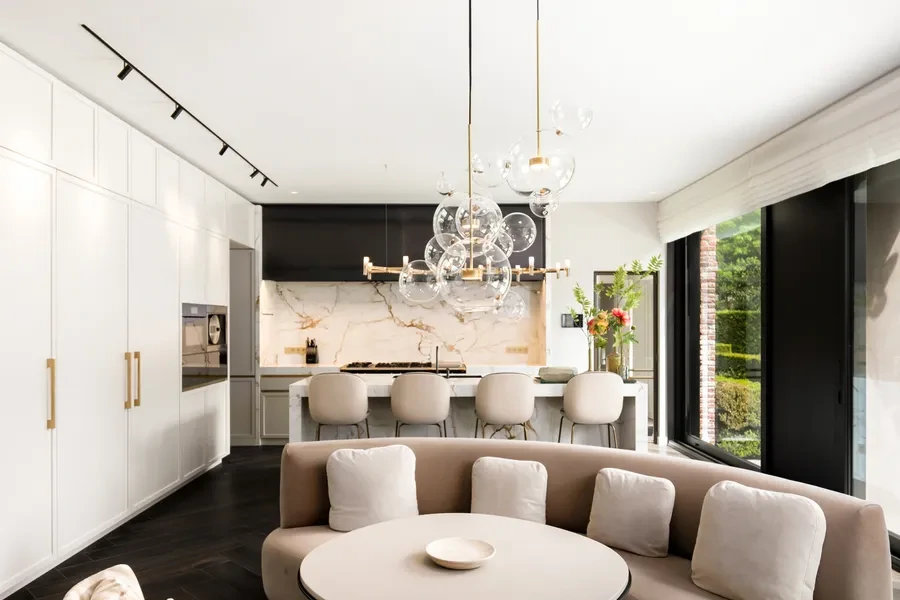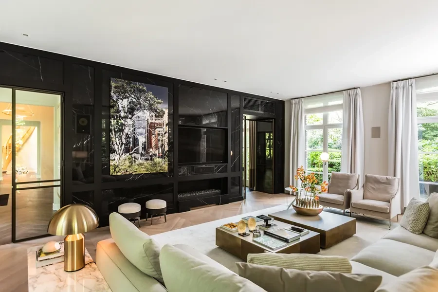 Step into a world of refined elegance through the grand entrance hall, where double doors unveil living spaces that seamlessly blend oak, modern porcelain, and leather into into a refined ensemble. The living and dining areas overlook the garden, bathed in natural light, with a striking black marble gas fireplace as the focal point—an effortlessly inviting setting for entertaining.
