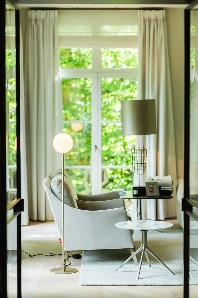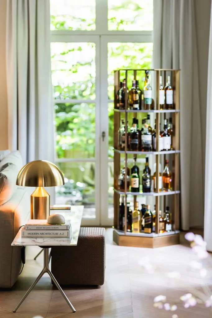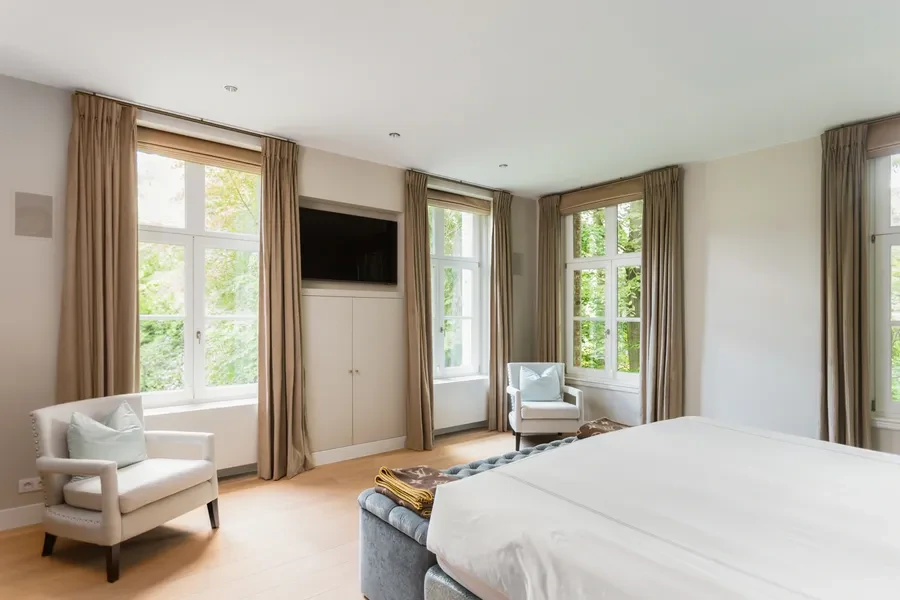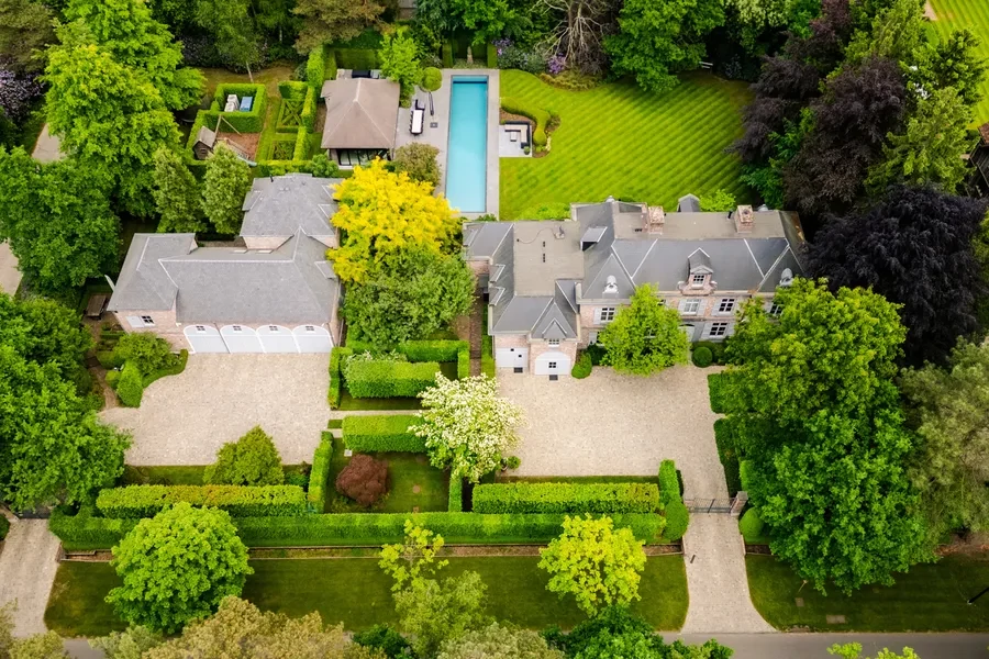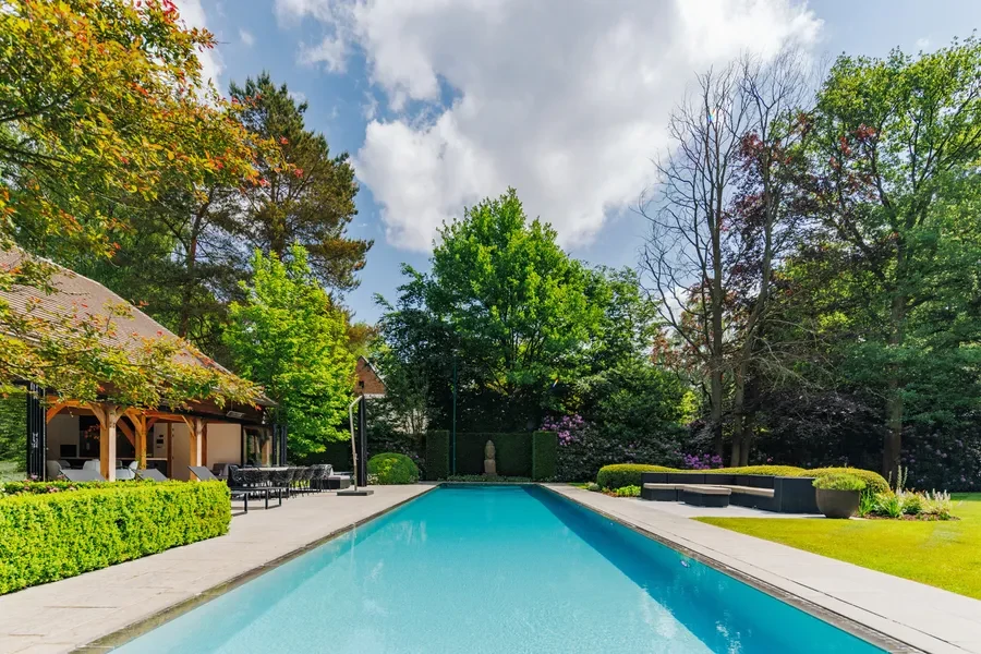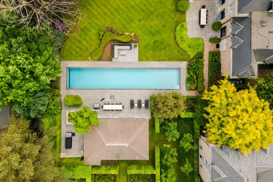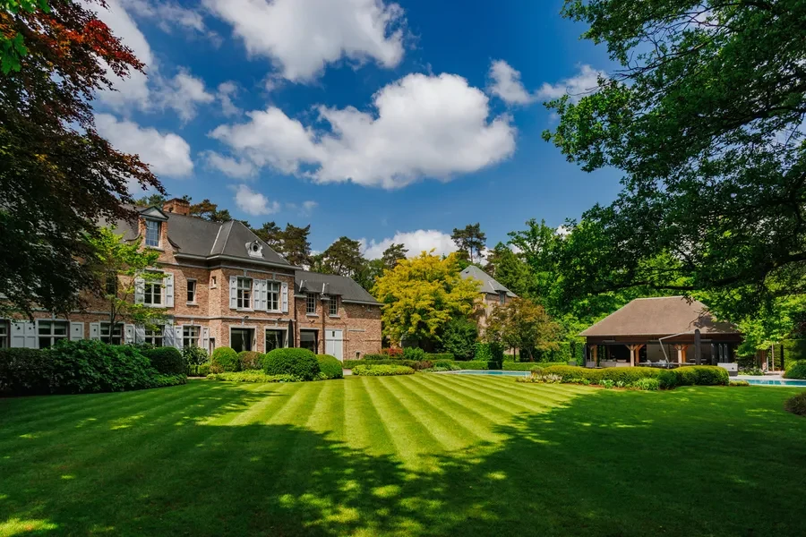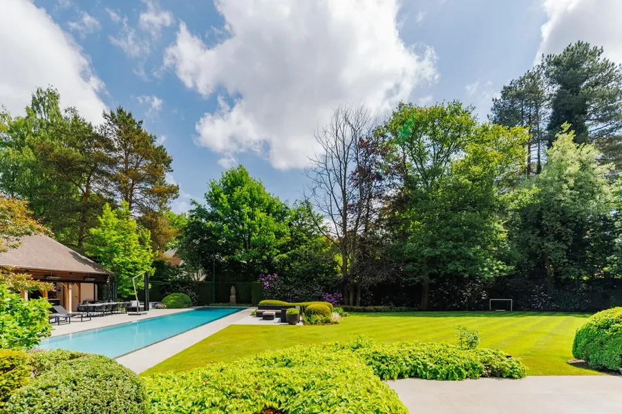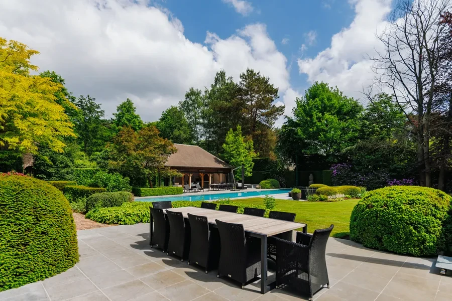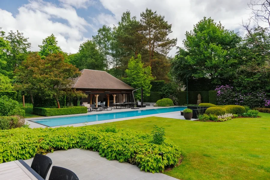 Outdoors, the luxury continues with a meticulously manicured garden, designed by Stefan Van Turnhout and a spectacular, king-sized swimming infinity pool flanked by a whirlpool made in stone and an elegant pool house fully fitted with airco, kitchen, bathroom and bedroom.