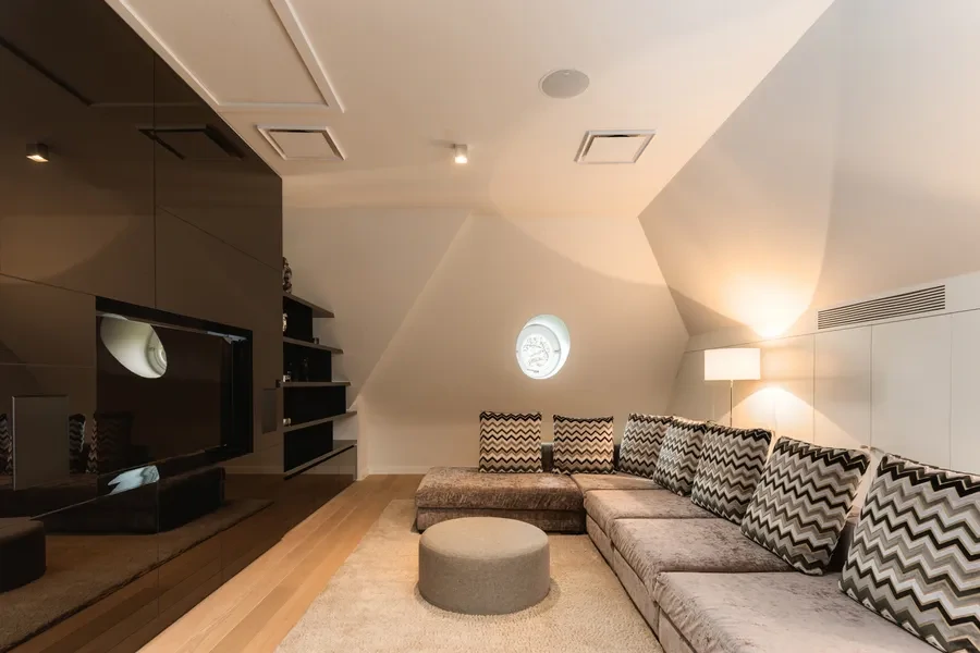 The lower level redefines luxury living: a wellness zone featuring hammam, sauna, and fitness room; a home cinema with plush seating; a wine cellar; a stylish office and a large hotel style laundry room. A private lift connects all four floors.