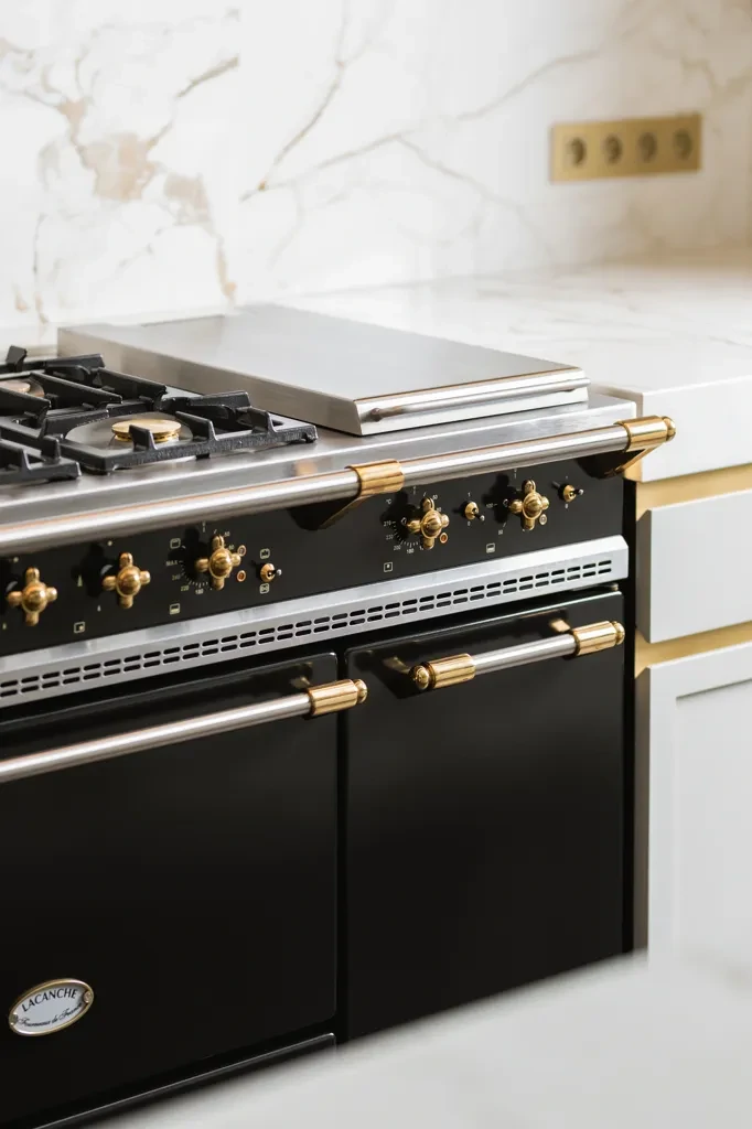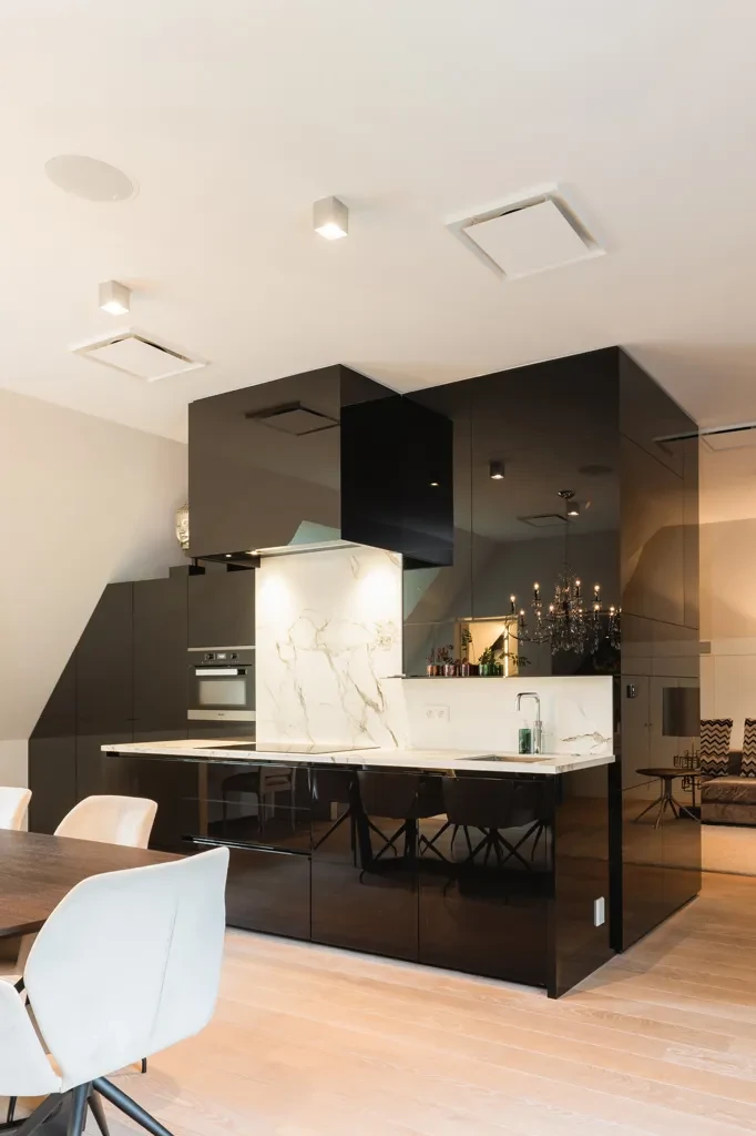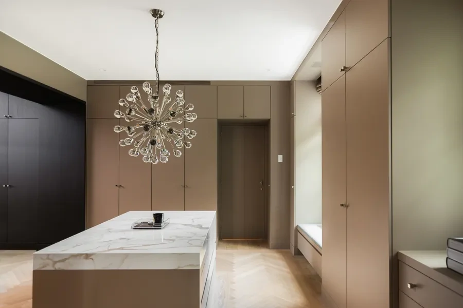 The kitchen is a culinary dream in Italian marble, fully outfitted with premium appliances by Miele, Lacanche range cooker, Two grand-scale Gaggenau refrigerators and complemented by a spacious pantry and large spacious service entrance with vestaire and additional storage room fully fitted out with closets and sink.