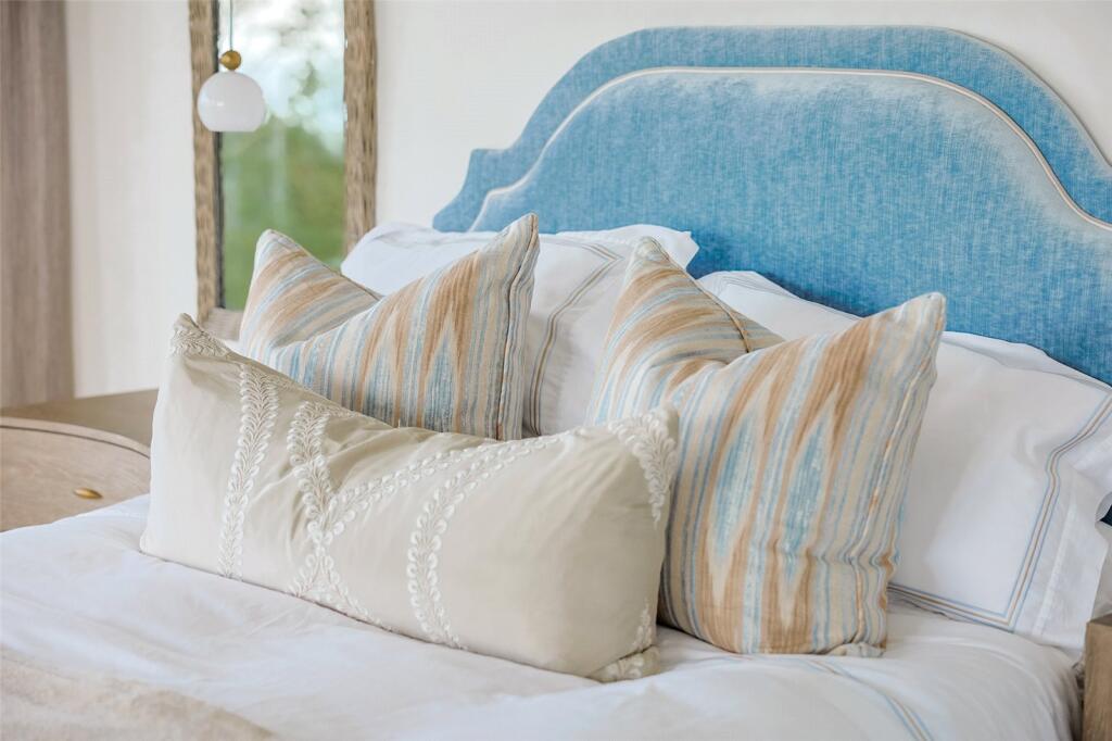 The kitchen boasts a range of wall and base units topped with quartz worktops and houses integrated appliances, including two AEG oven/grills, an AEG microwave, an AEG dishwasher, a single stainless-steel sink with a Quooker tap, and a Fisher & Paykel fridge/freezer. A kitchen island provides extra storage, quartz worktops, an AEG 5-ring induction hob, a hidden AEG downdraft cooker hood, a wine cooler, and a breakfast bar for up to four stools. There is also ample room to accommodate a generous dining set, allowing you to sit and enjoy the beautiful outlooks.